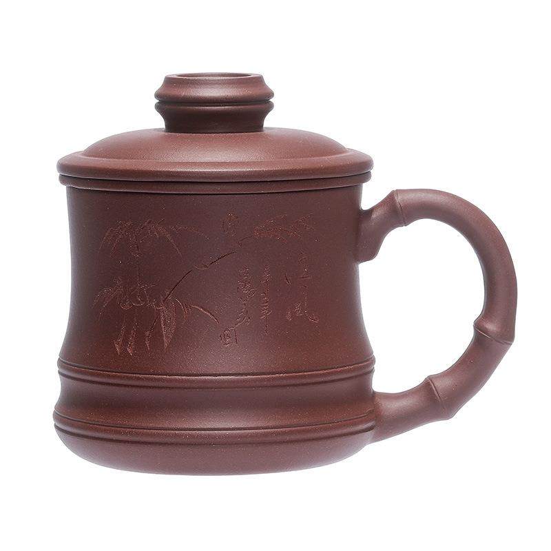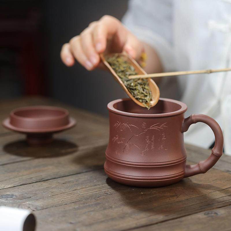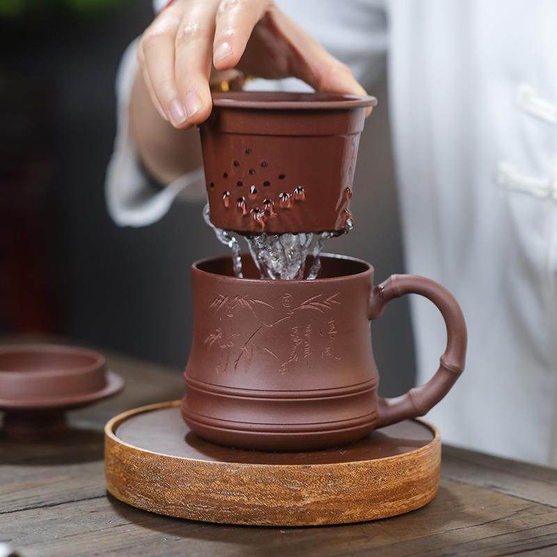 紫砂盖杯宜兴全手工刻绘竹节紫砂杯三件套办公室泡茶杯茶具