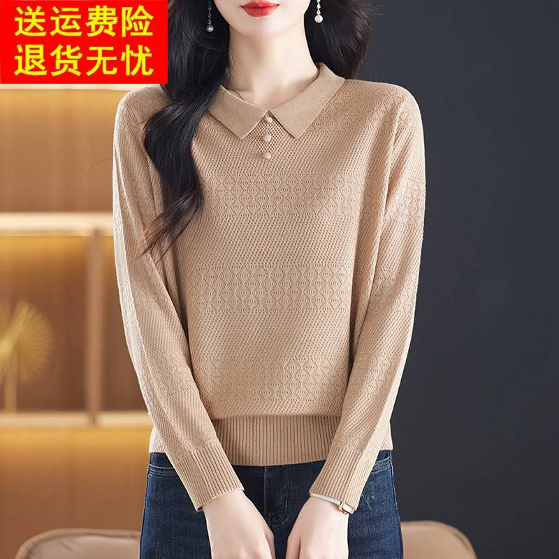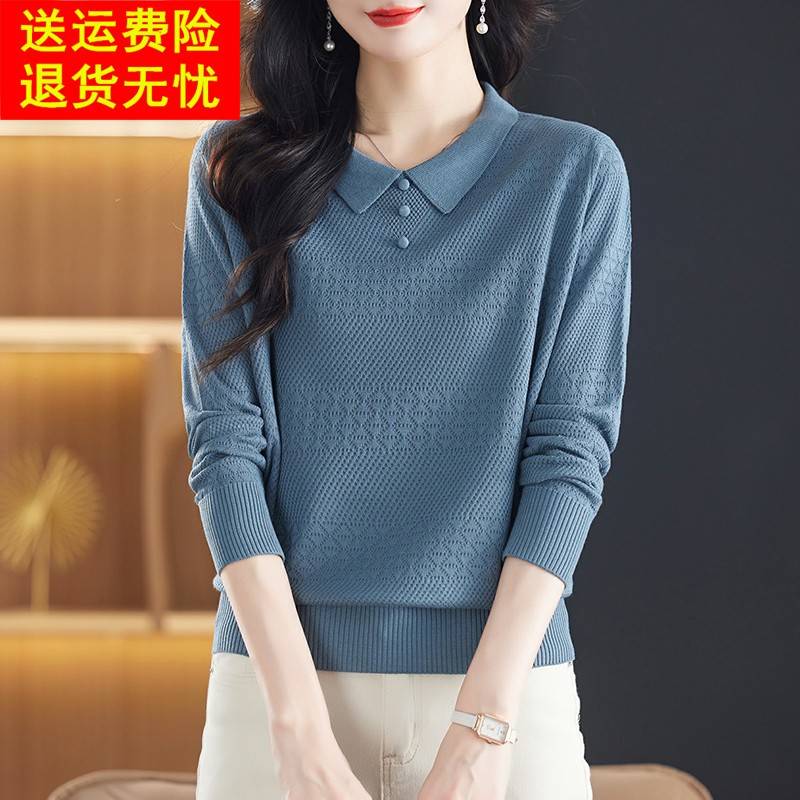 鄂尔多斯市桑蚕丝长袖t恤女春装新款妈妈薄上衣polo领针织打底衫