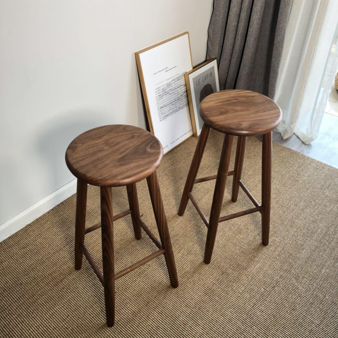 北美黑胡桃木实木高脚凳简约现代酒吧椅圆凳家用日式吧台凳子餐椅