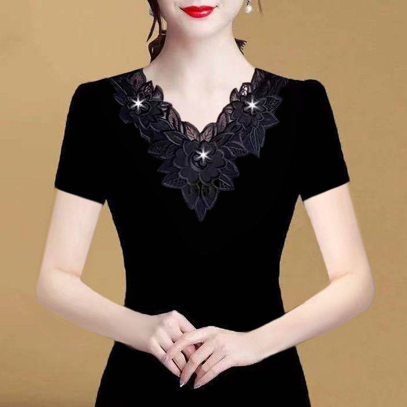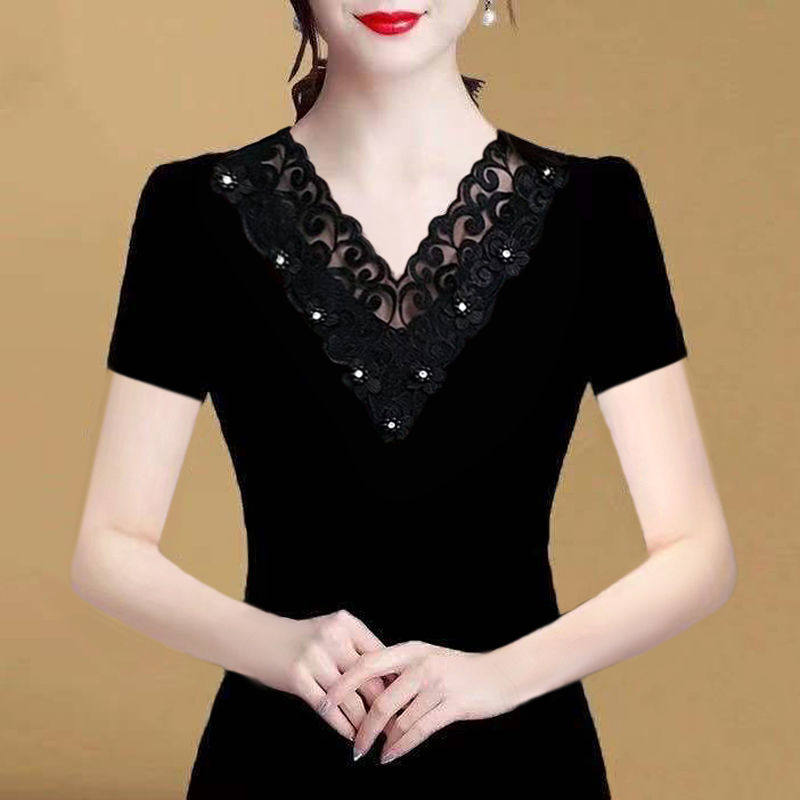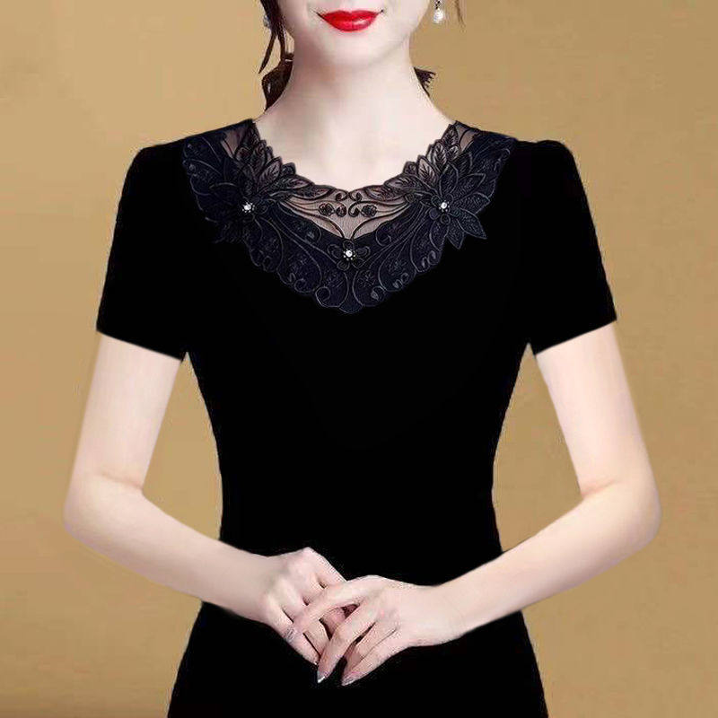 圆领蕾丝打底衫女短袖t恤2025夏装新品修身薄款网纱大码女装上衣