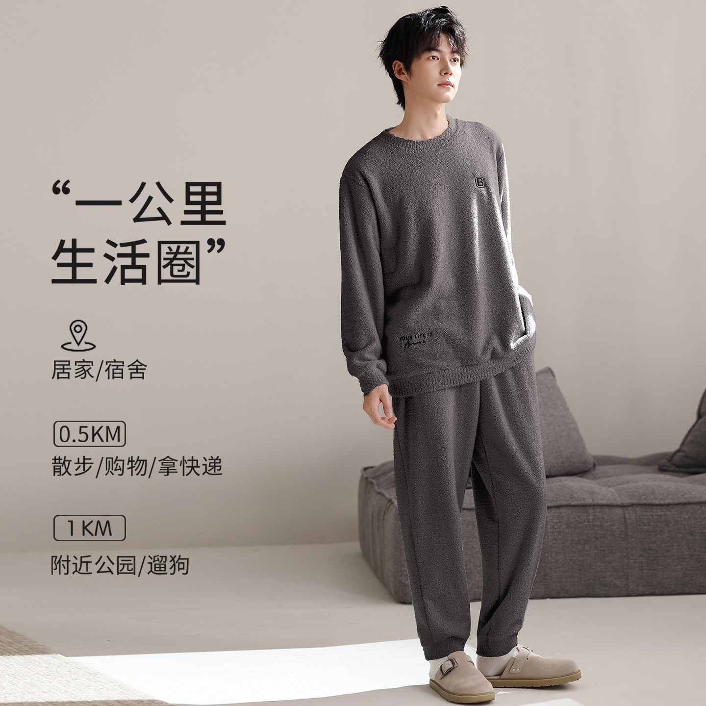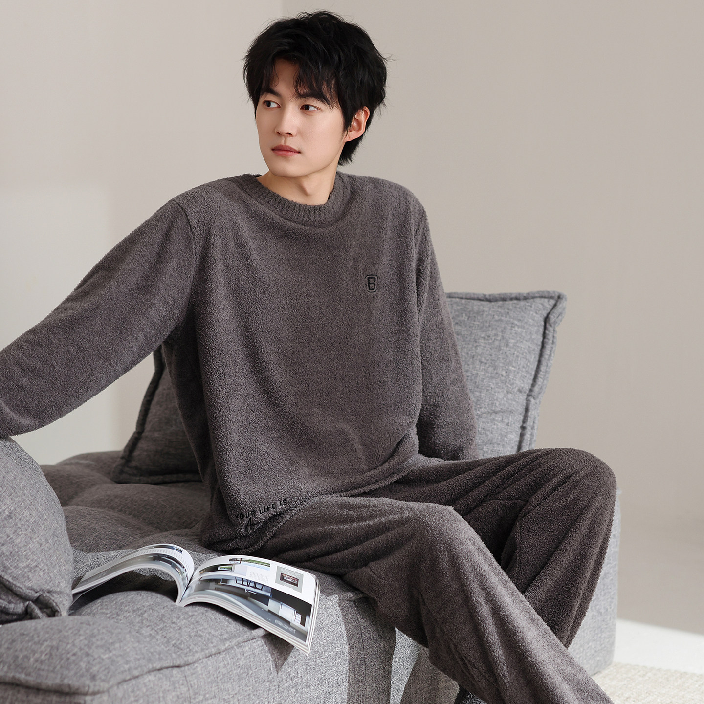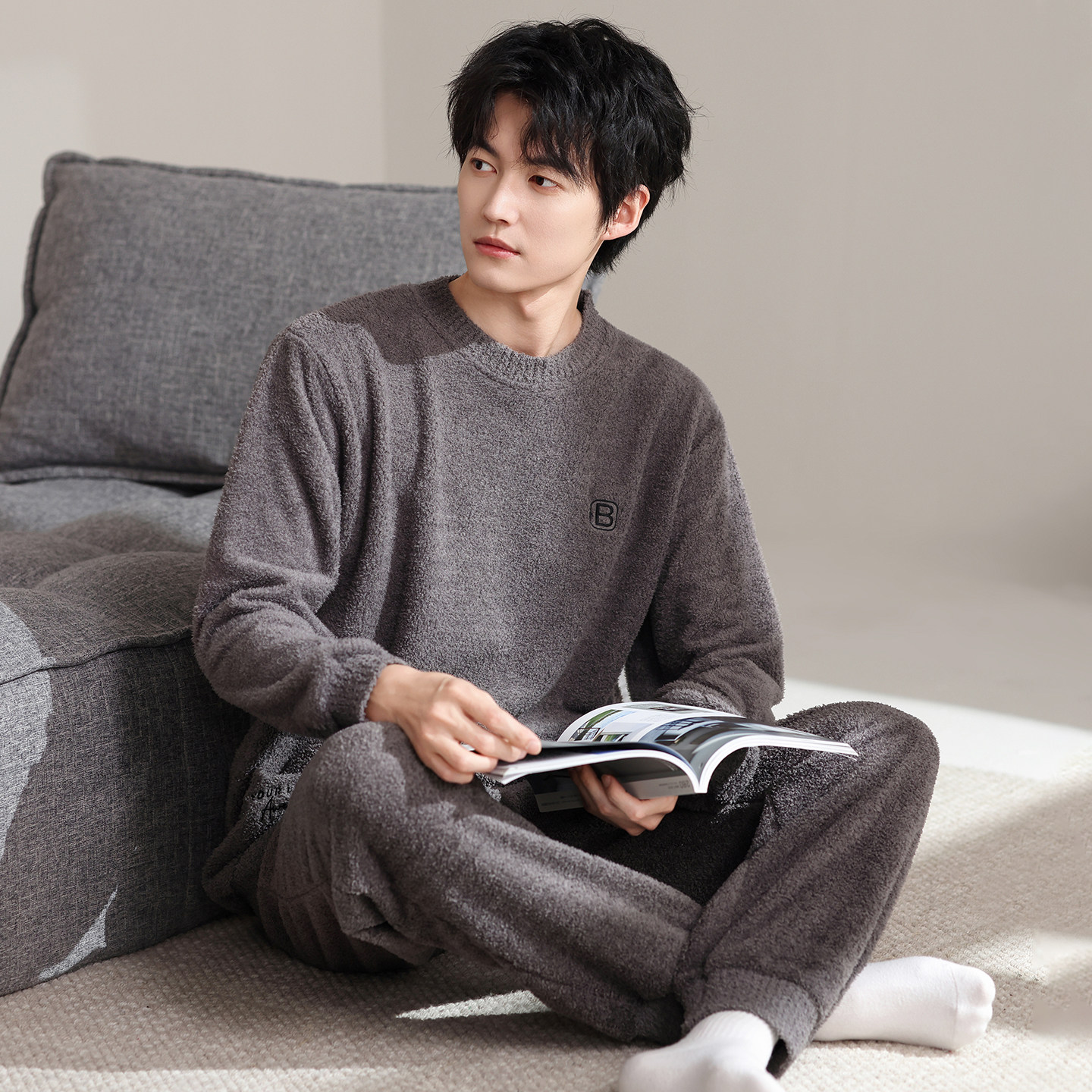 芬腾可安男士睡衣男款冬季2026新款半边绒加厚加绒深灰家居服冬天