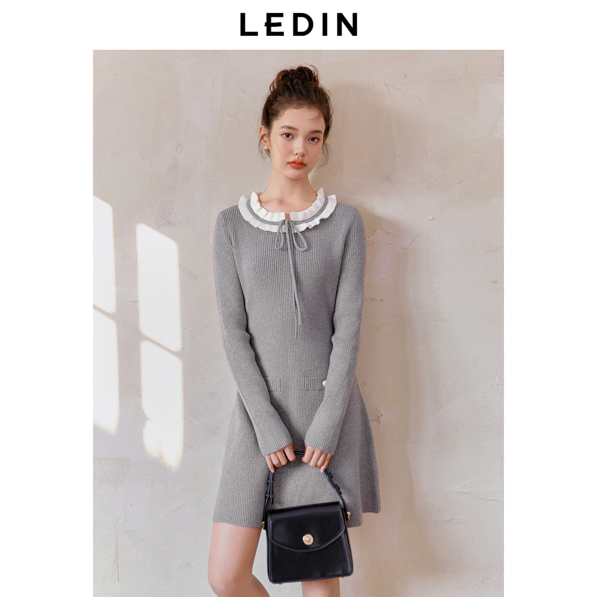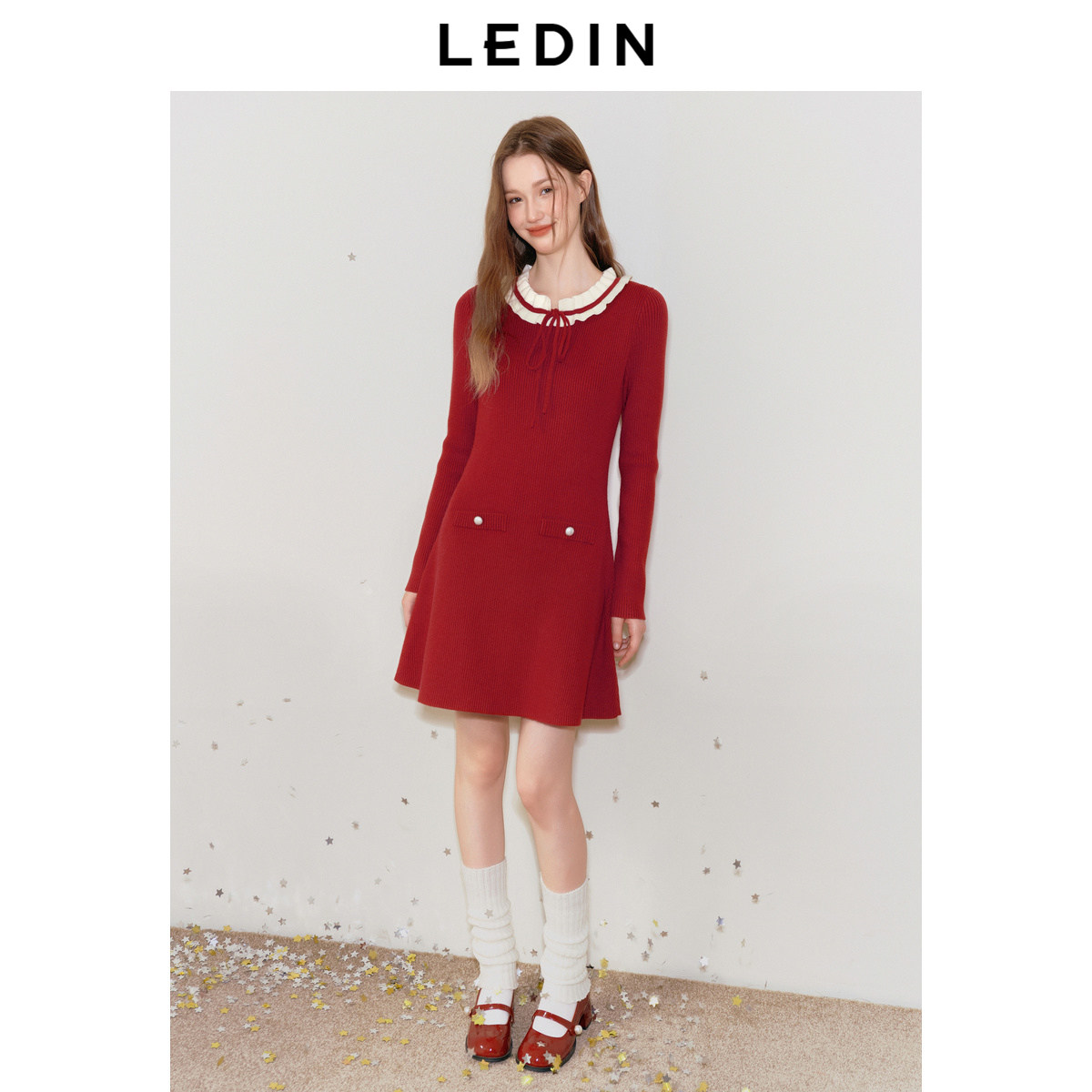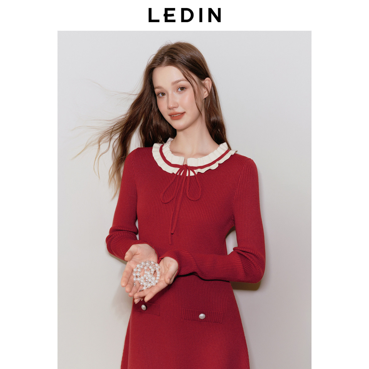 乐町韩系小香风连衣裙中国红毛衣裙木耳边领氛围感新年圣诞连衣裙