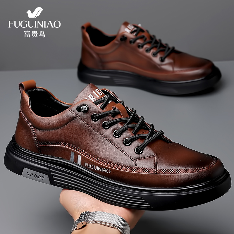 富贵鸟男鞋真皮透气男士休闲板鞋青年时尚潮鞋皮鞋男软底防滑系带