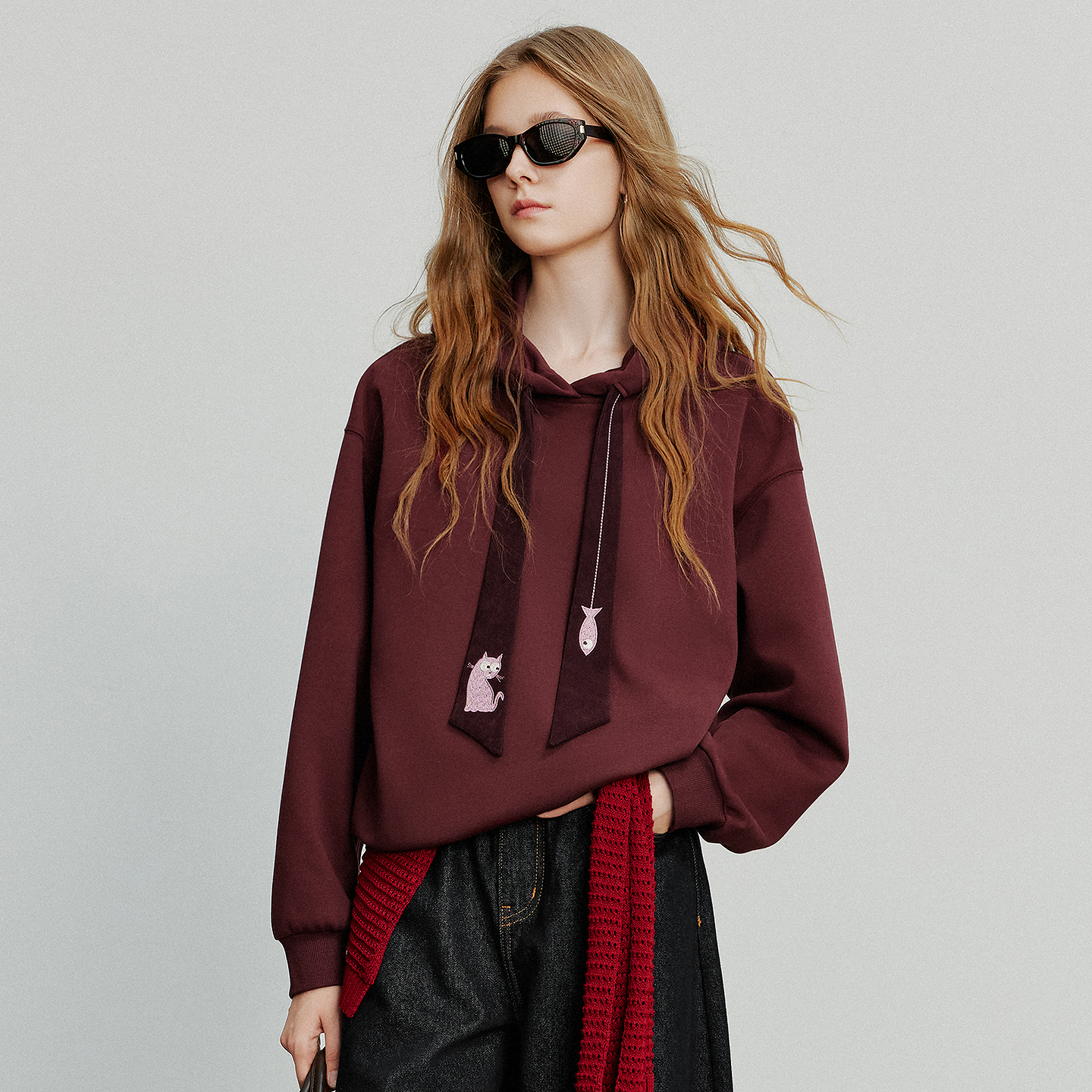初语卫衣女2025秋季新款棉质猫咪刺绣领带连帽学院风小个子上衣