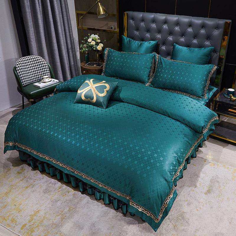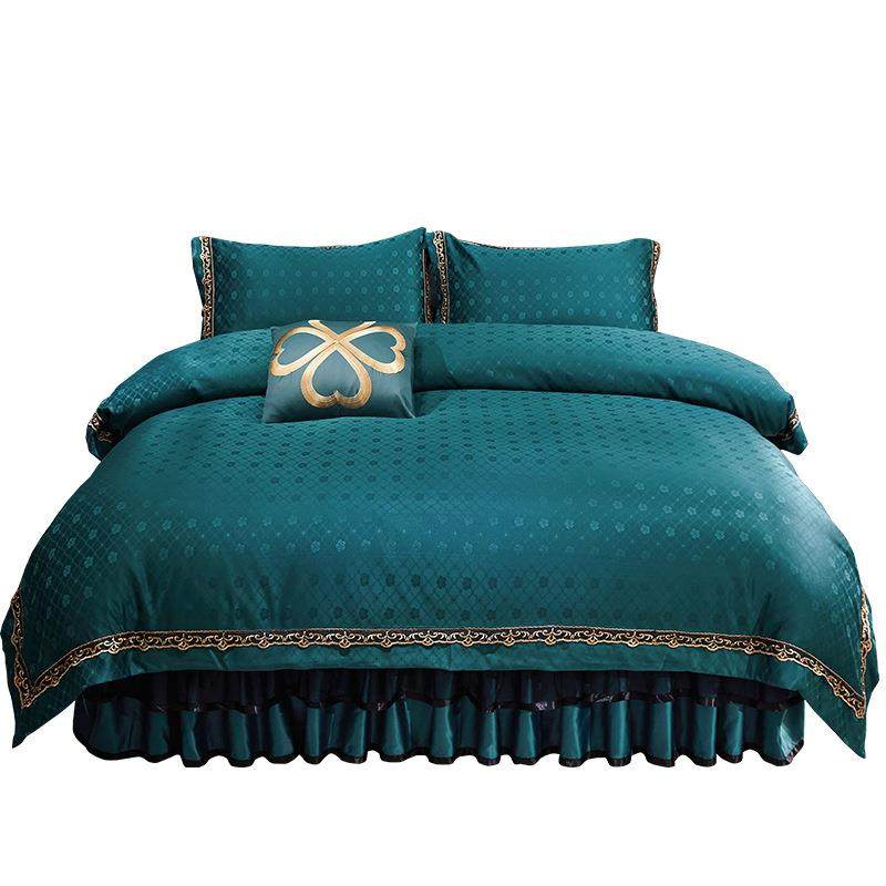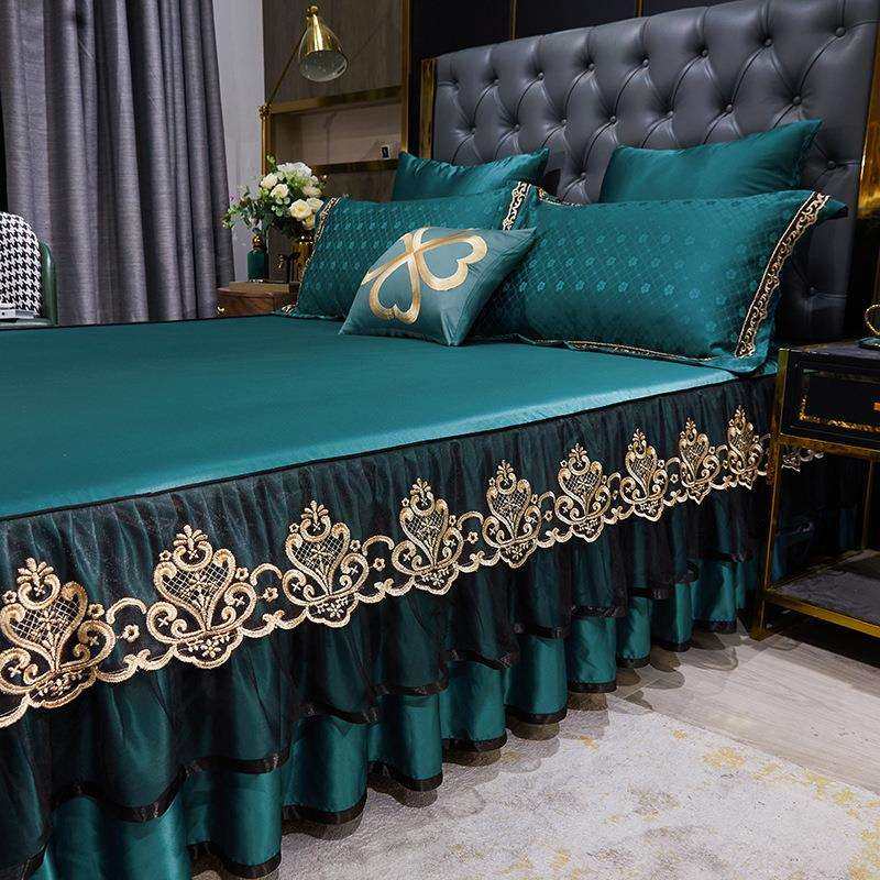 夏季水洗真丝贡缎提花床裙四件套简约欧式风蕾丝公主床罩外贸跨境