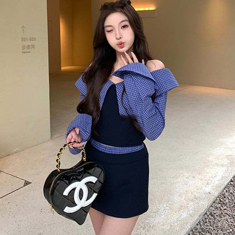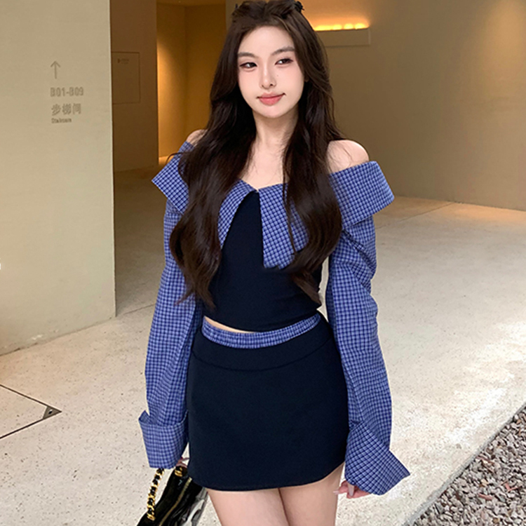 蓝调时刻 秋装新款一字肩条纹拼接收腰衬衫上衣a字短裙裙两件套女