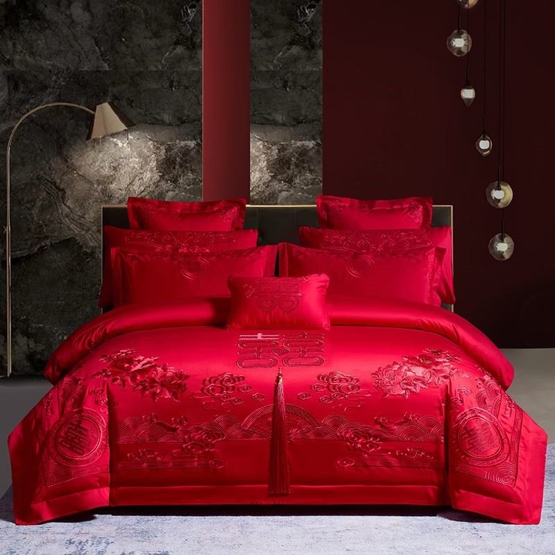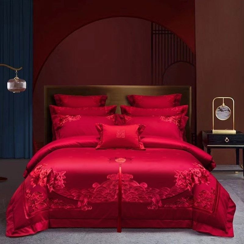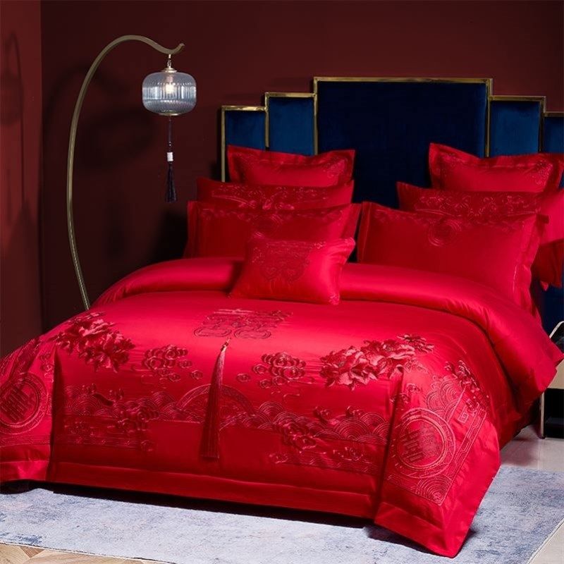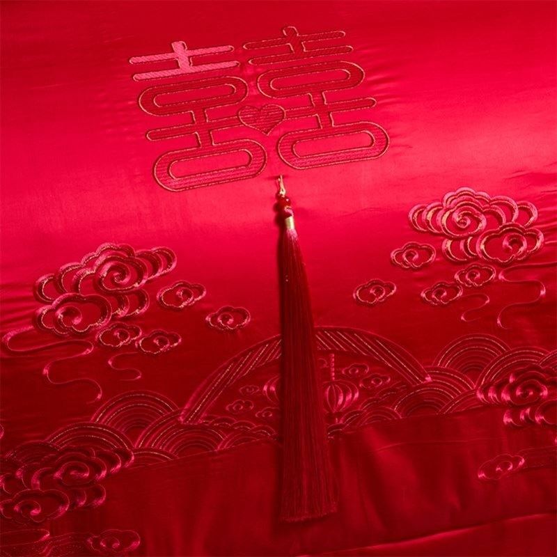 全棉婚庆四件组婚礼床上用品大红色结婚被套床单婚房套件龙凤