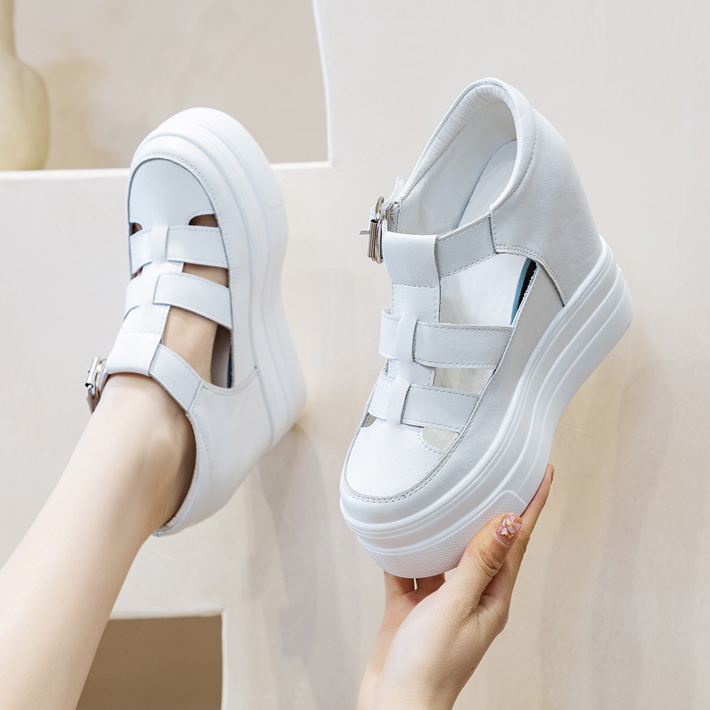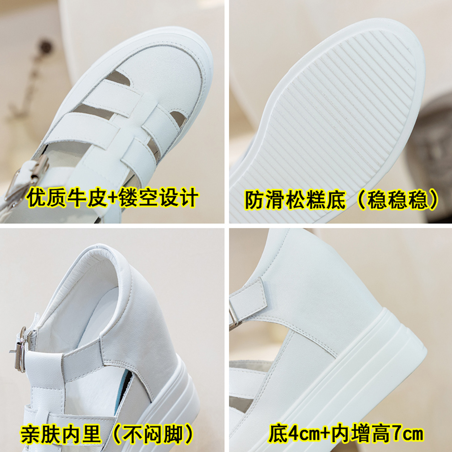 11厘米12公分内增高女鞋夏天真皮厚底镂空小白鞋包头凉鞋猪笼鞋子