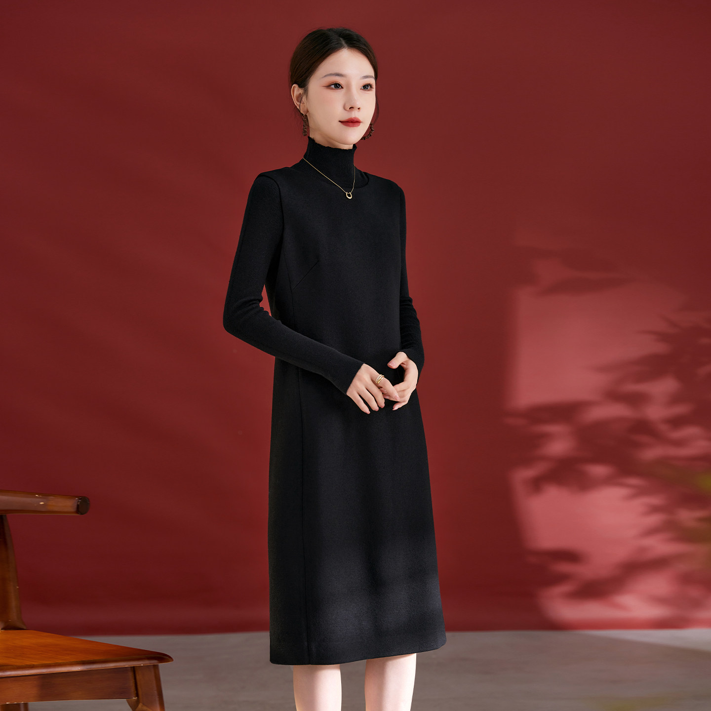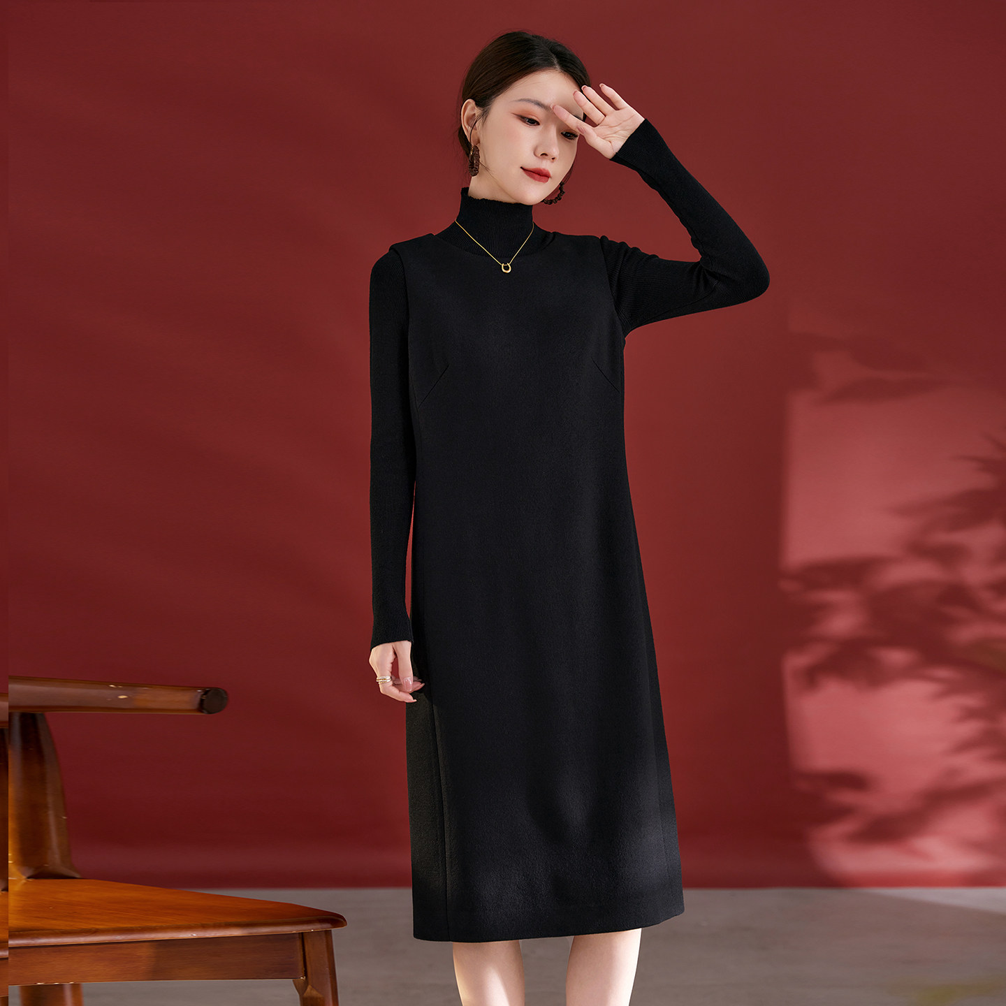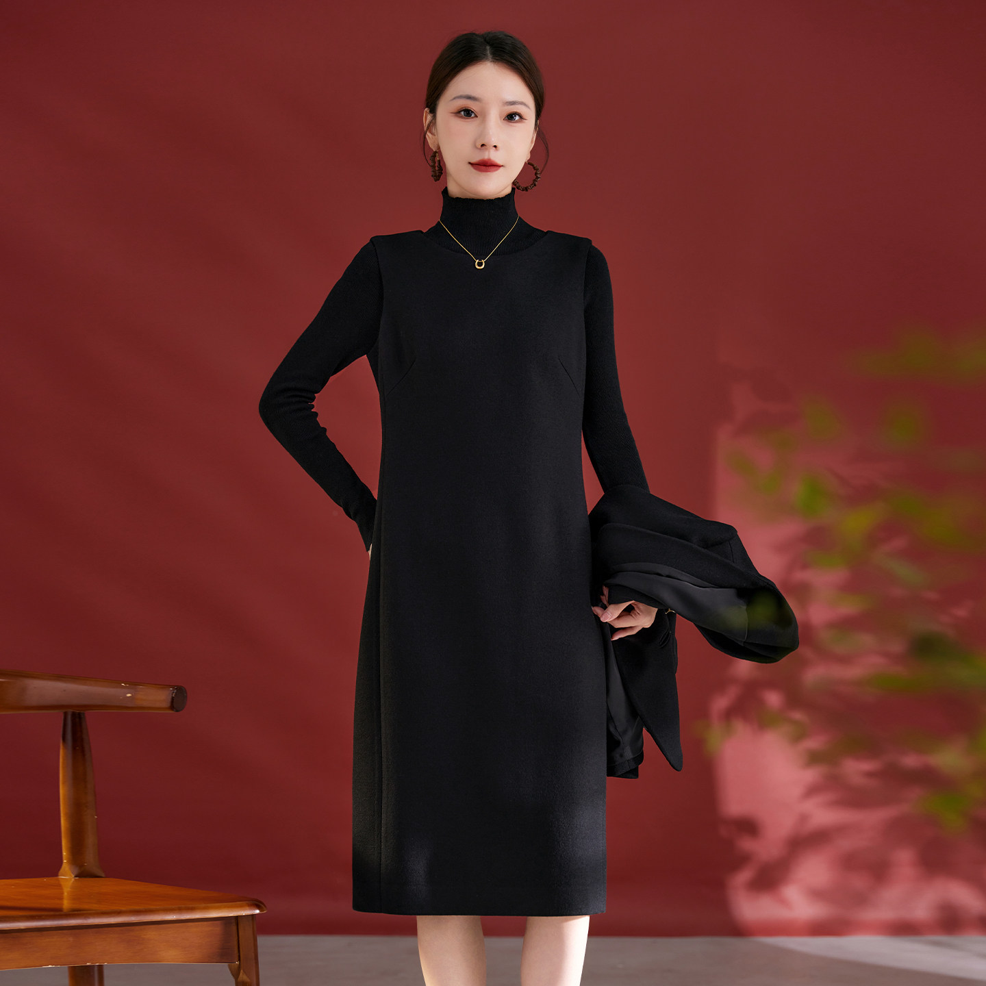 水墨佳人2025年秋冬新款高端无袖中长裙女绵羊毛呢打底背心连衣裙