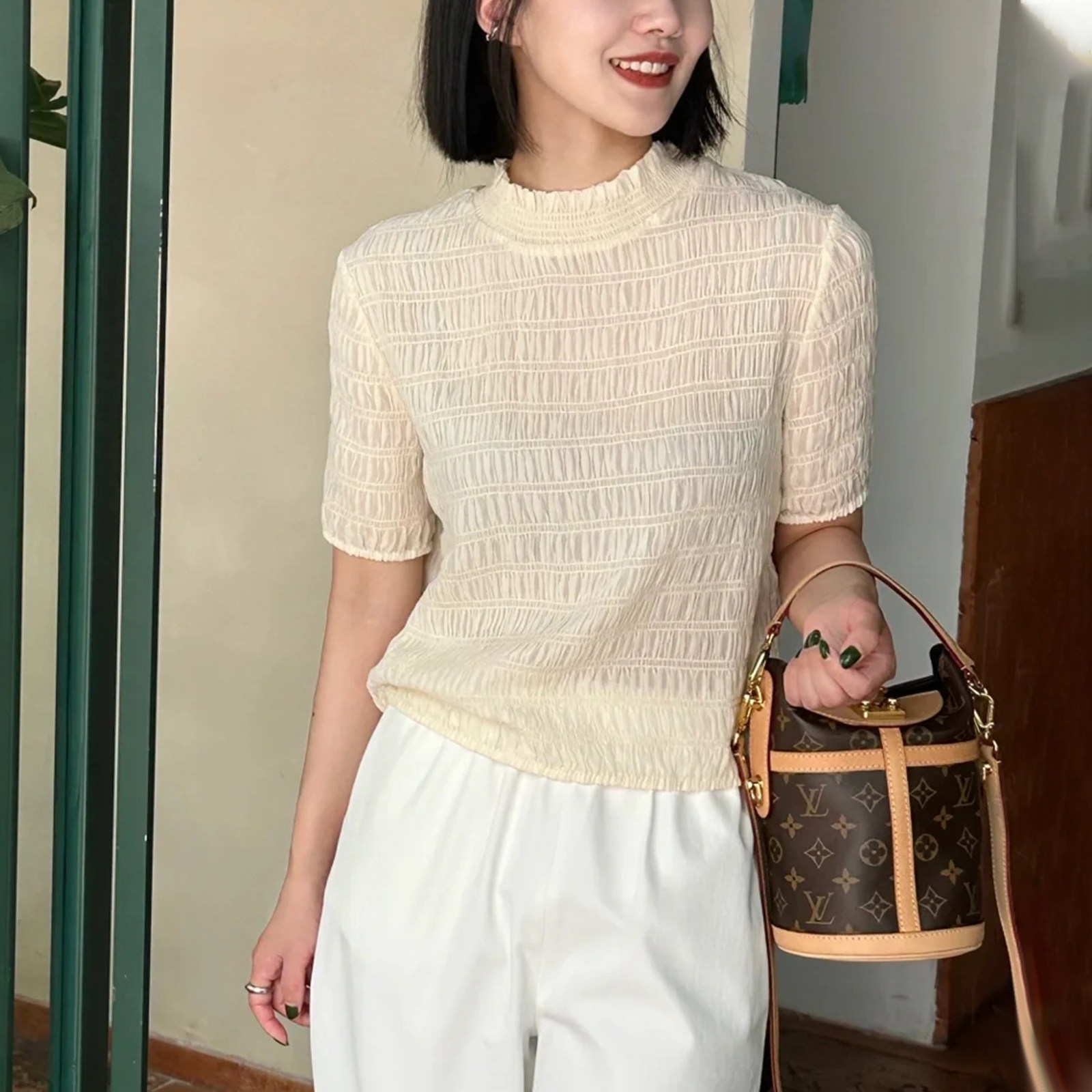 特清~重工打揽 桑蚕丝 真丝乔其褶皱小立领短袖衬衫 休闲上衣