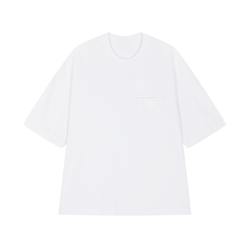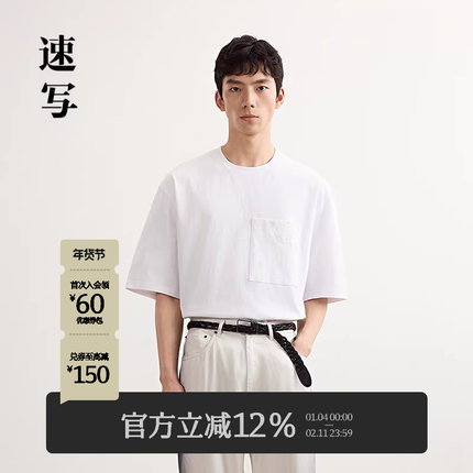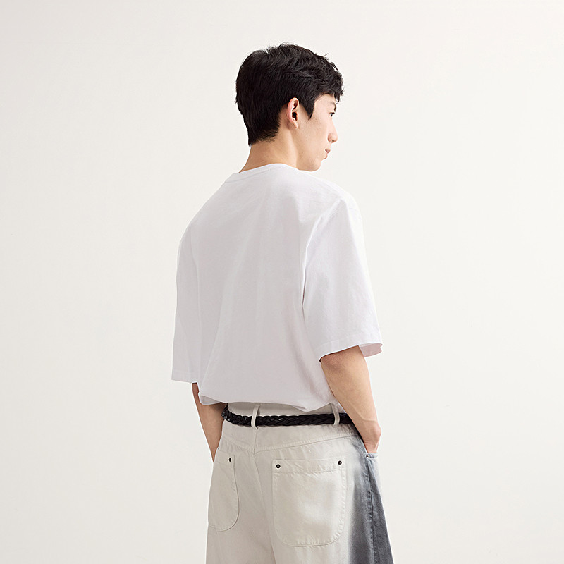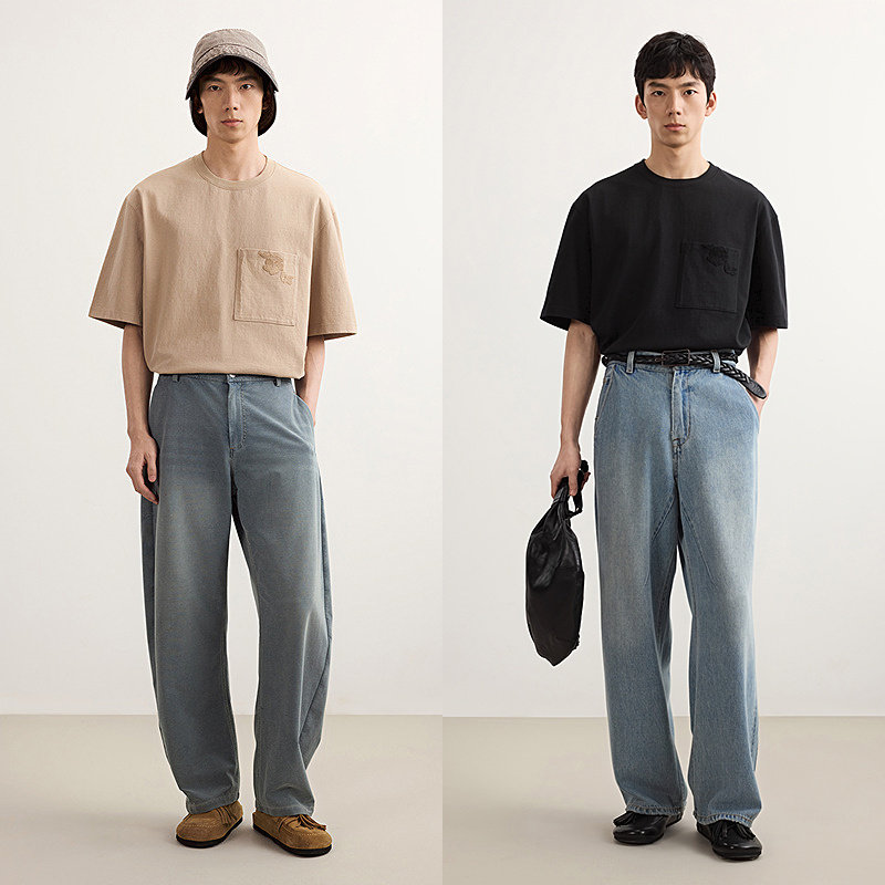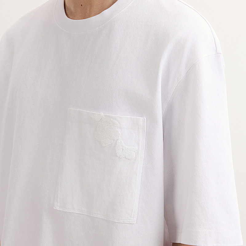 速写男装早春新款男士短袖T恤石榴花刺绣宽松纯色上衣休闲通勤