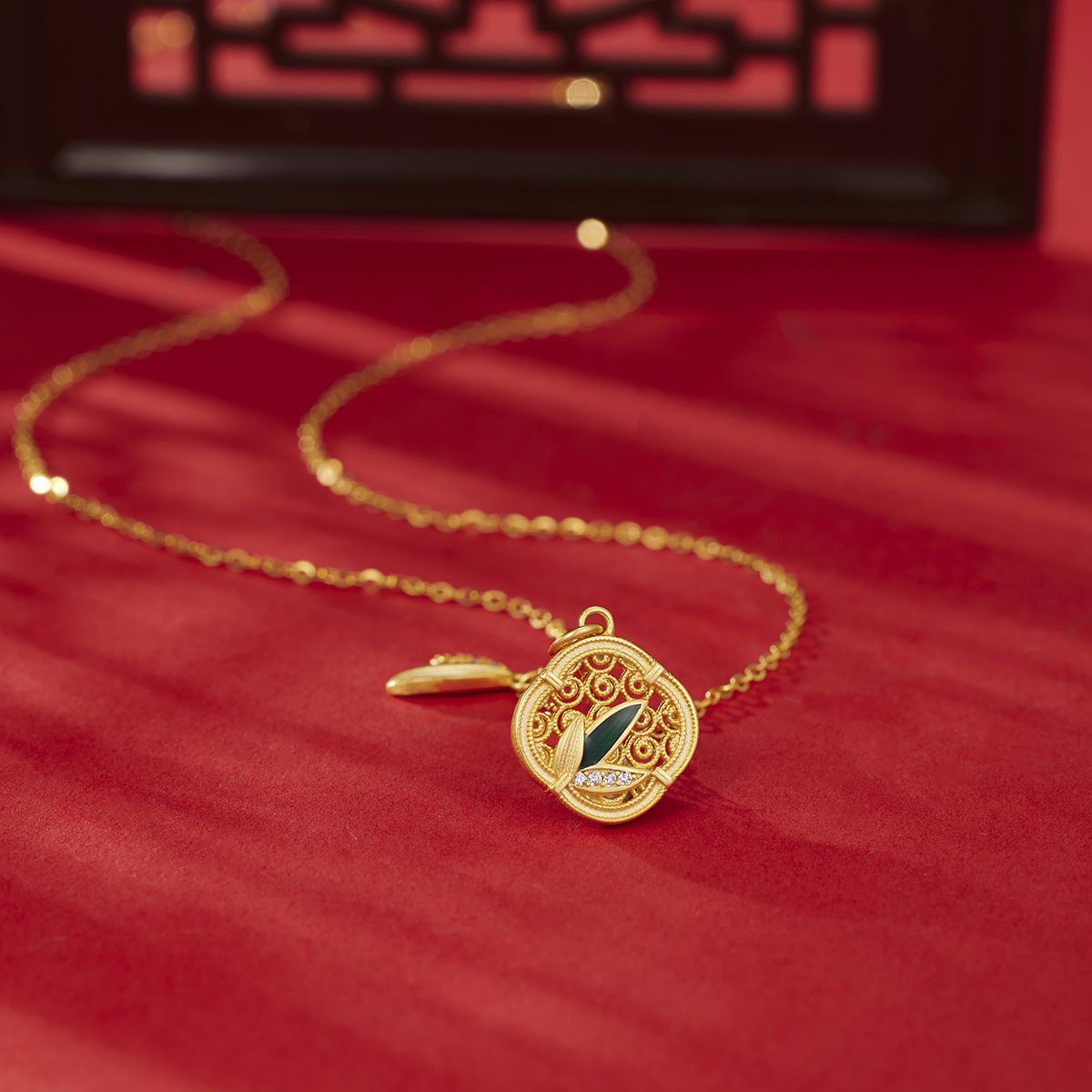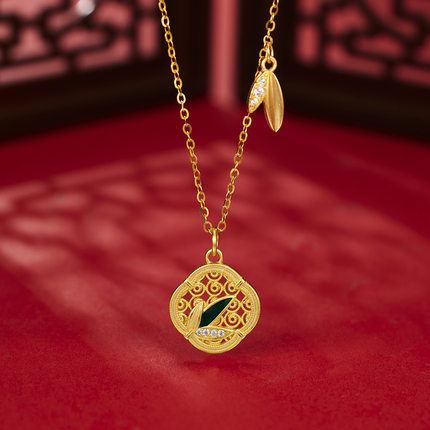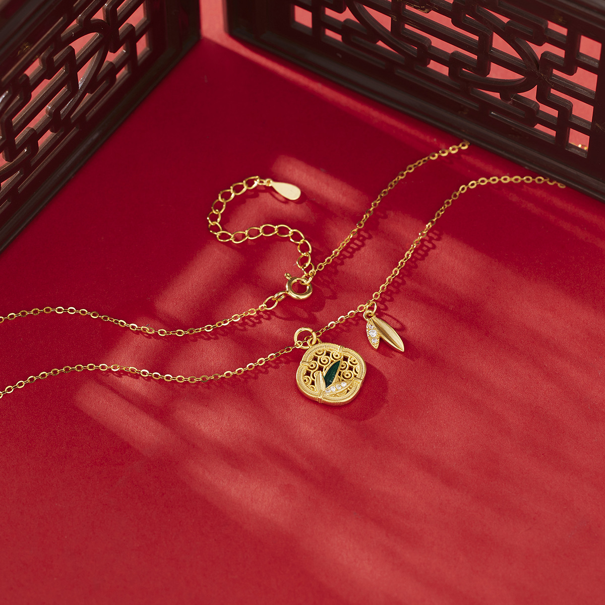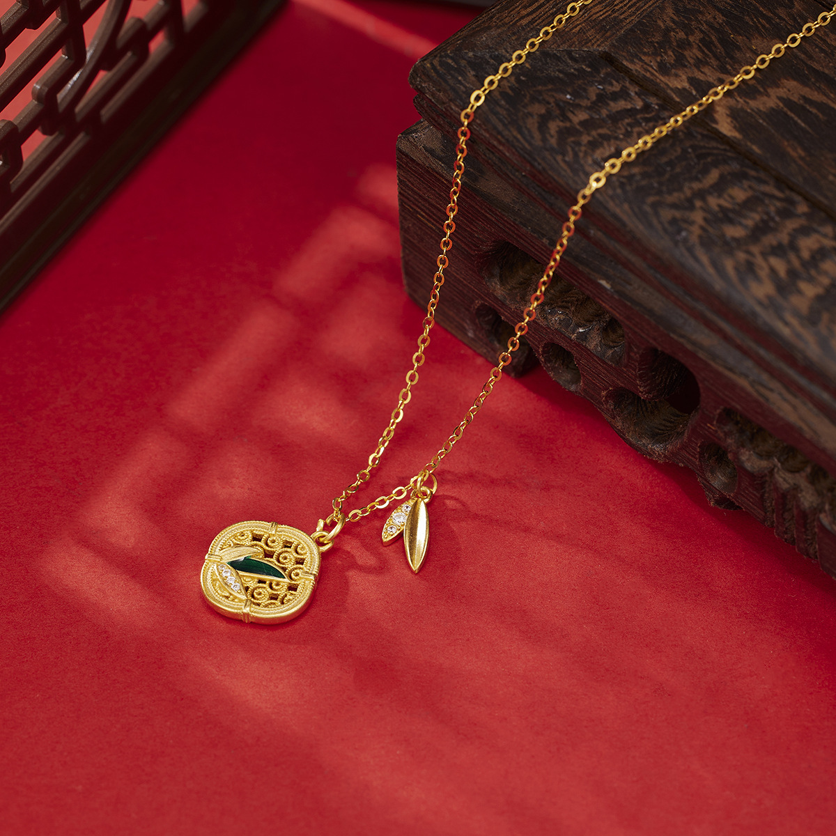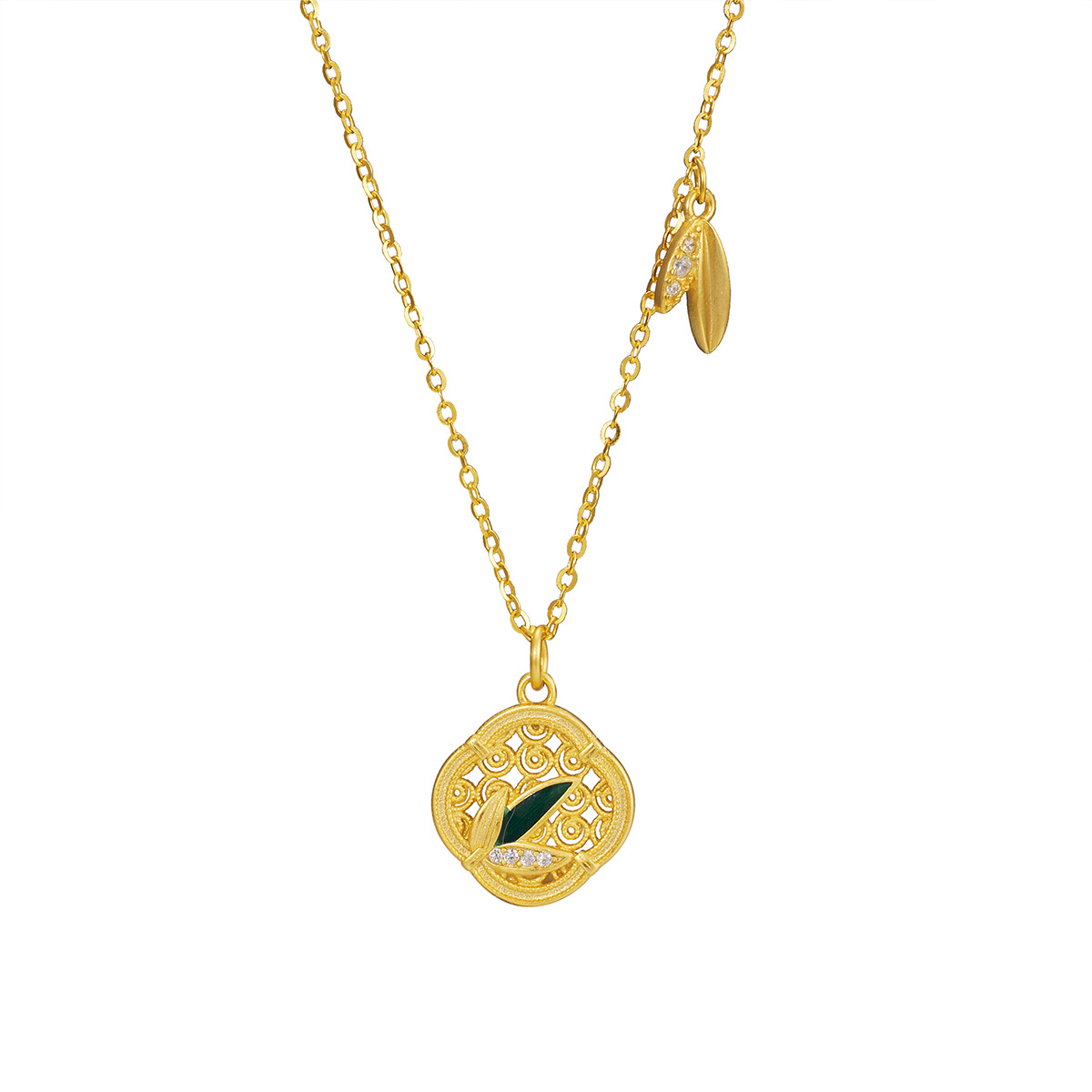 s925纯银镀黄金色新款胸有成竹珐琅项链女花丝镂空四叶草锁骨链子