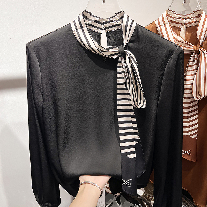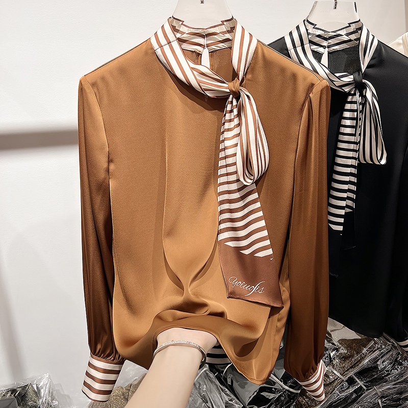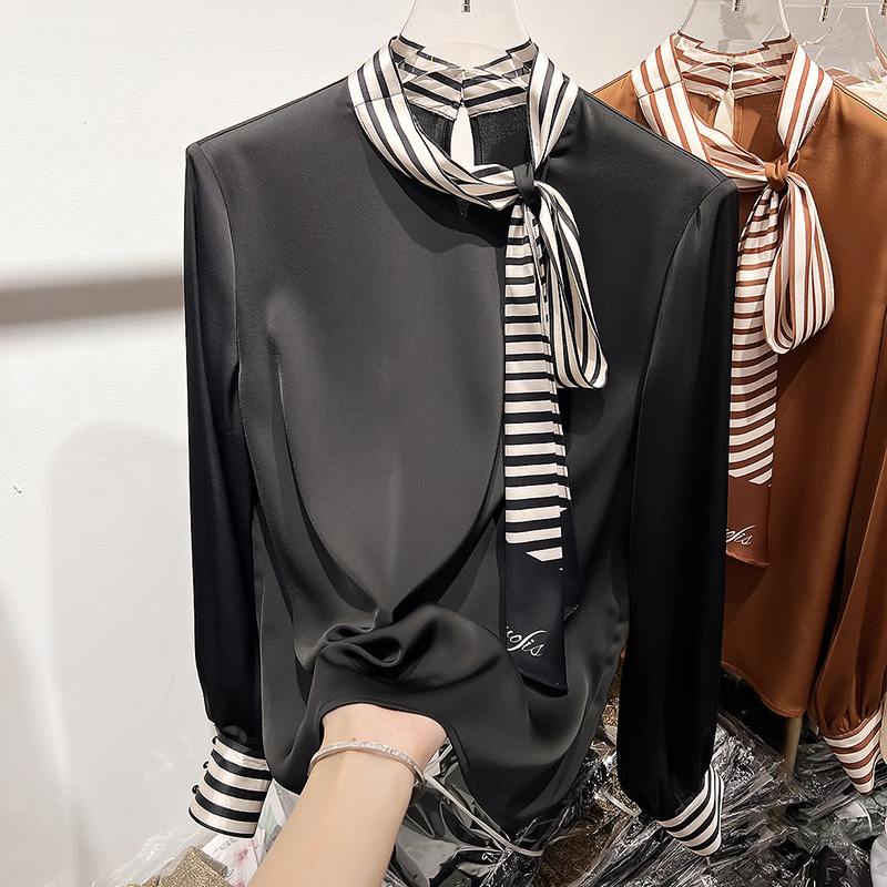 2024新款法式气质立领条纹拼色系带套头长袖雪纺衫女秋季薄款上衣