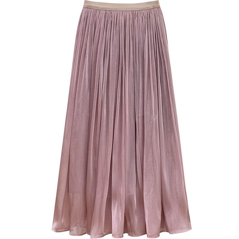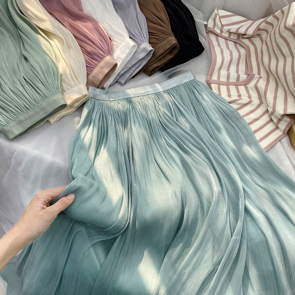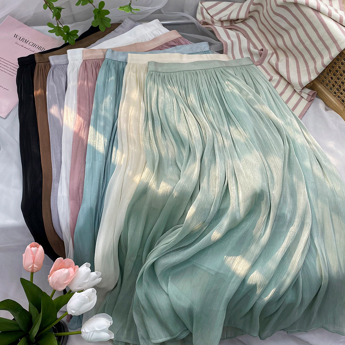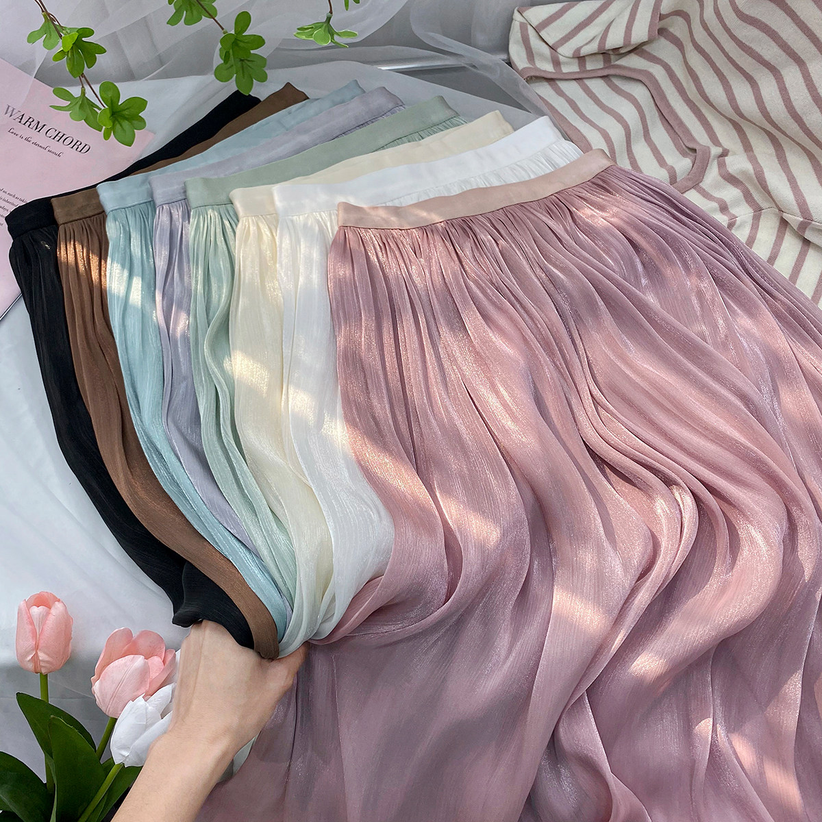 高级光泽感流光珠纱雪纺百褶皱半身裙女夏复古洋气质中长款a字裙