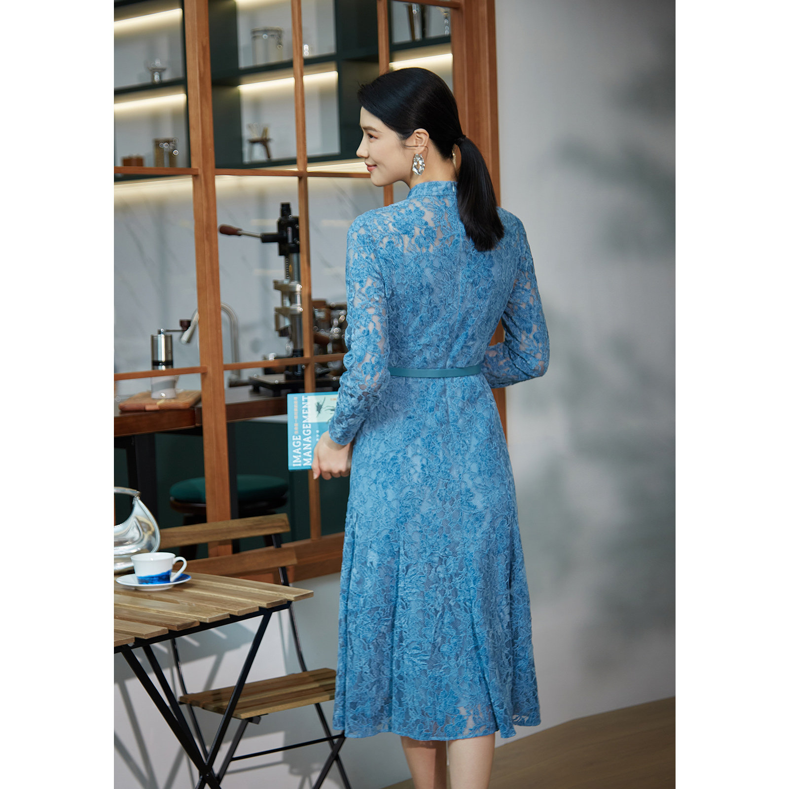 BBLLUUEE粉蓝衣橱复古雅致鱼尾植绒蕾丝连衣裙女2025冬新款立领裙