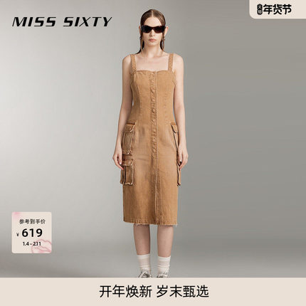 Miss Sixty复古卡其色牛仔连身连衣裙女背带美式工装废土风长裙