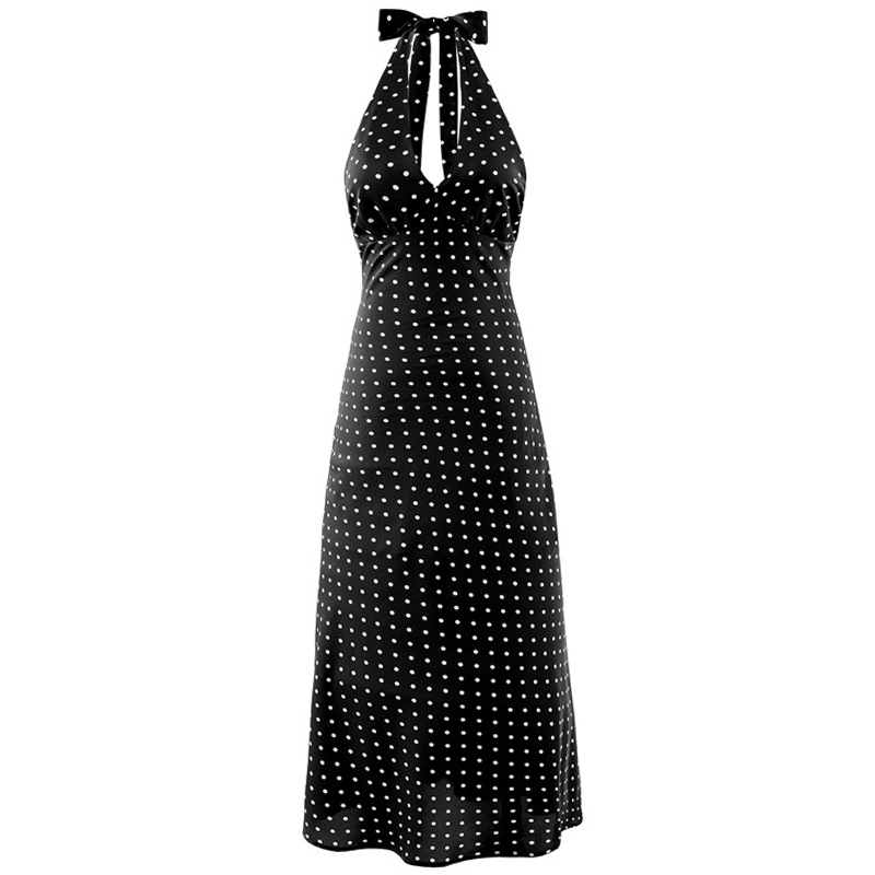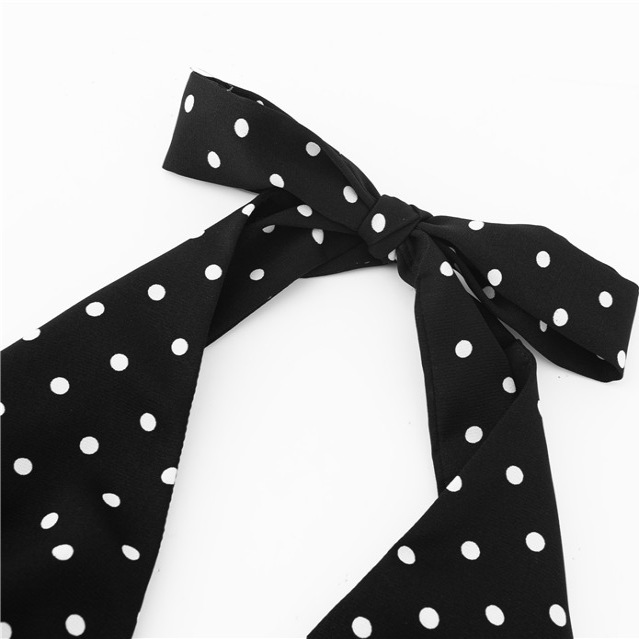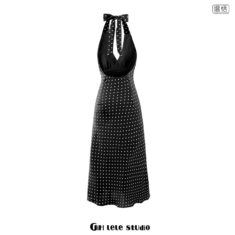【包邮】法式风情复古挂脖系带连衣裙女波点印花V领性感露背长裙