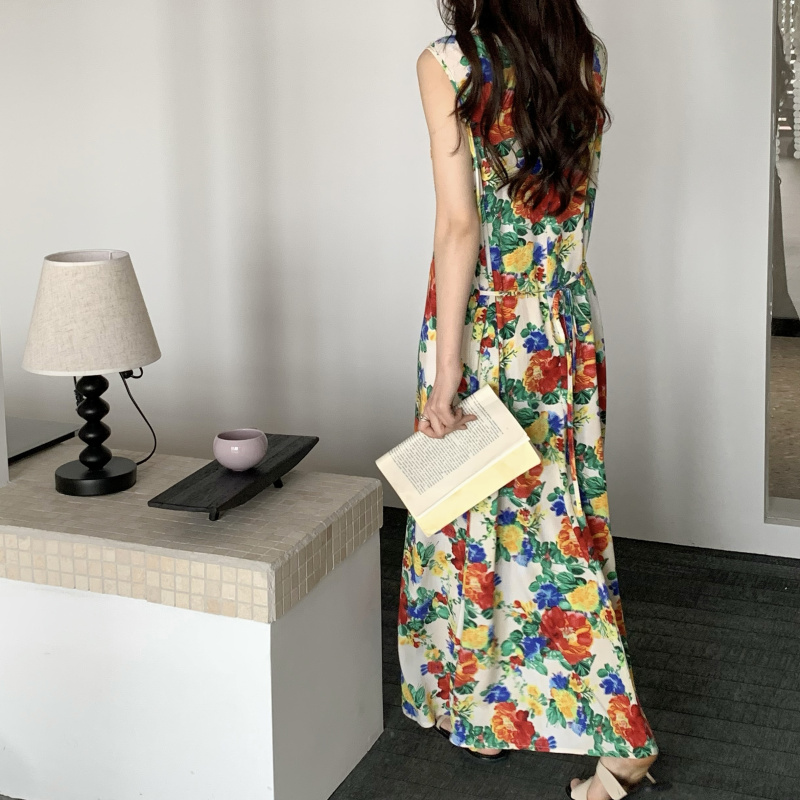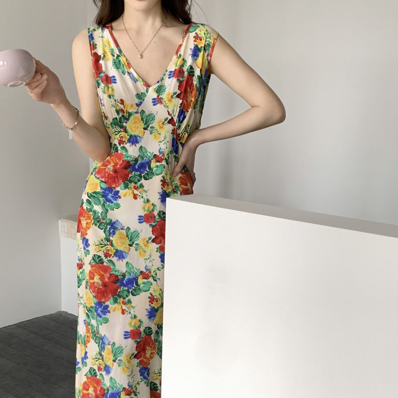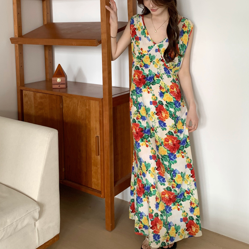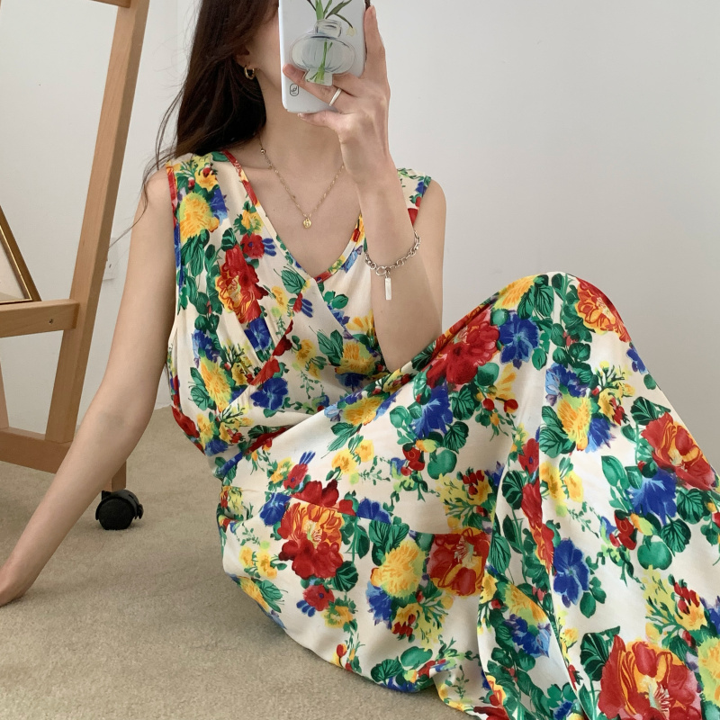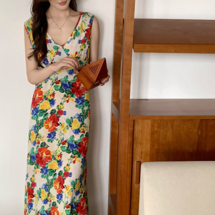 棉绸睡裙法式复古印花无袖连衣裙女夏季艺术感度假裙性感茶歇长裙