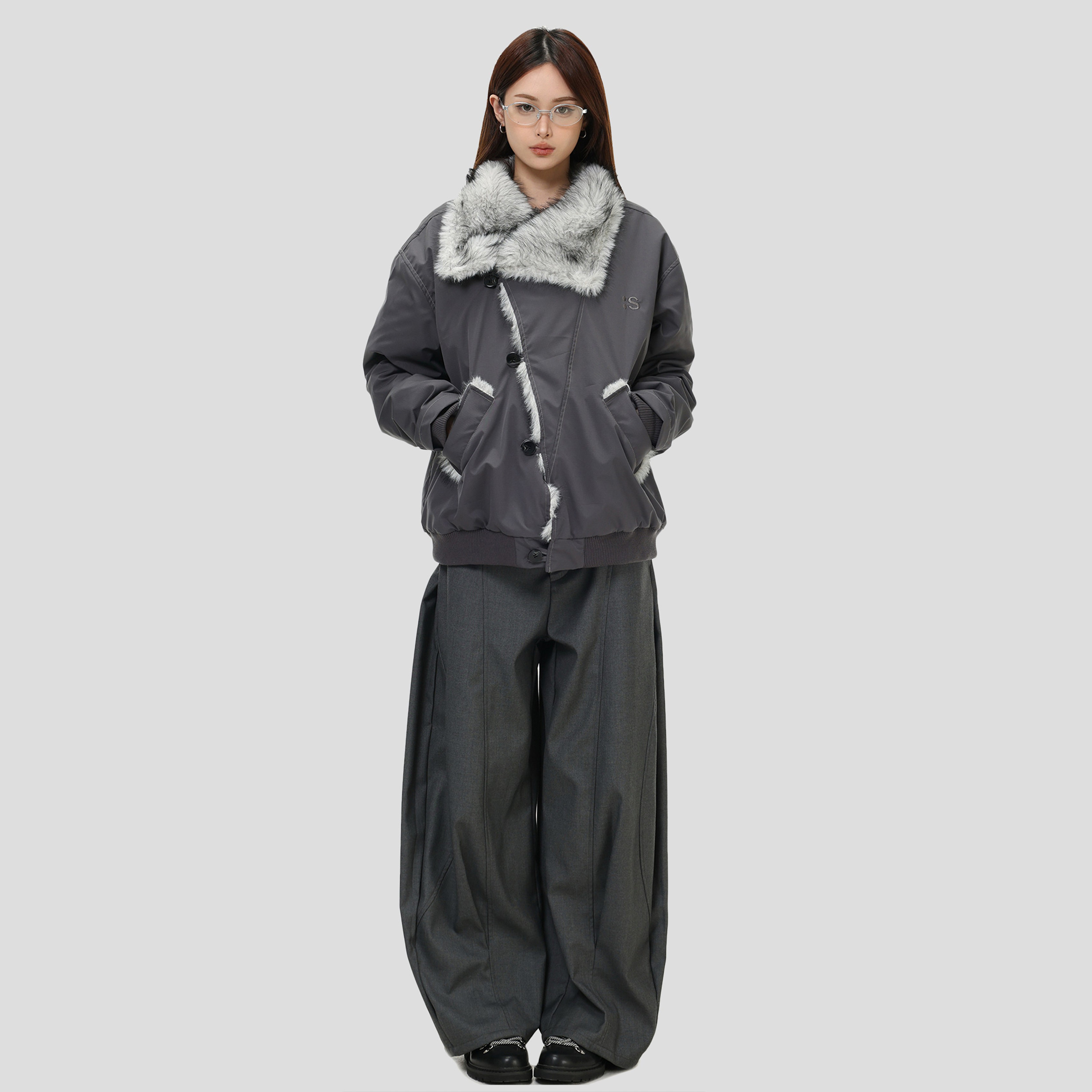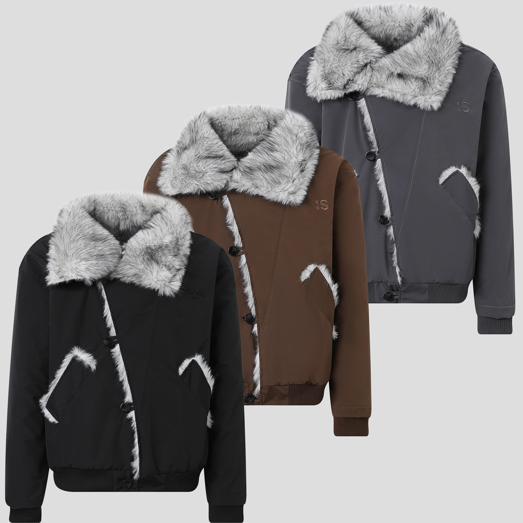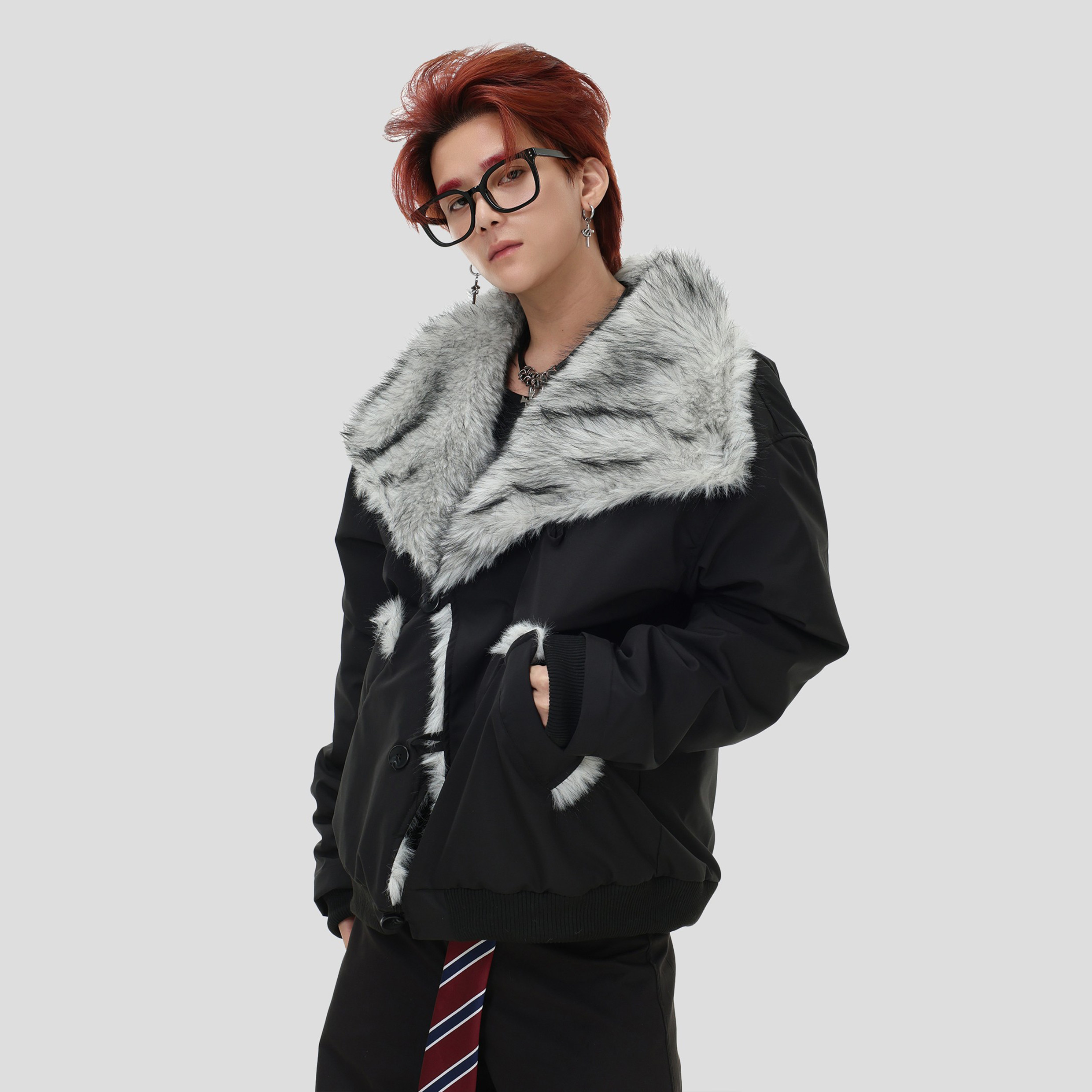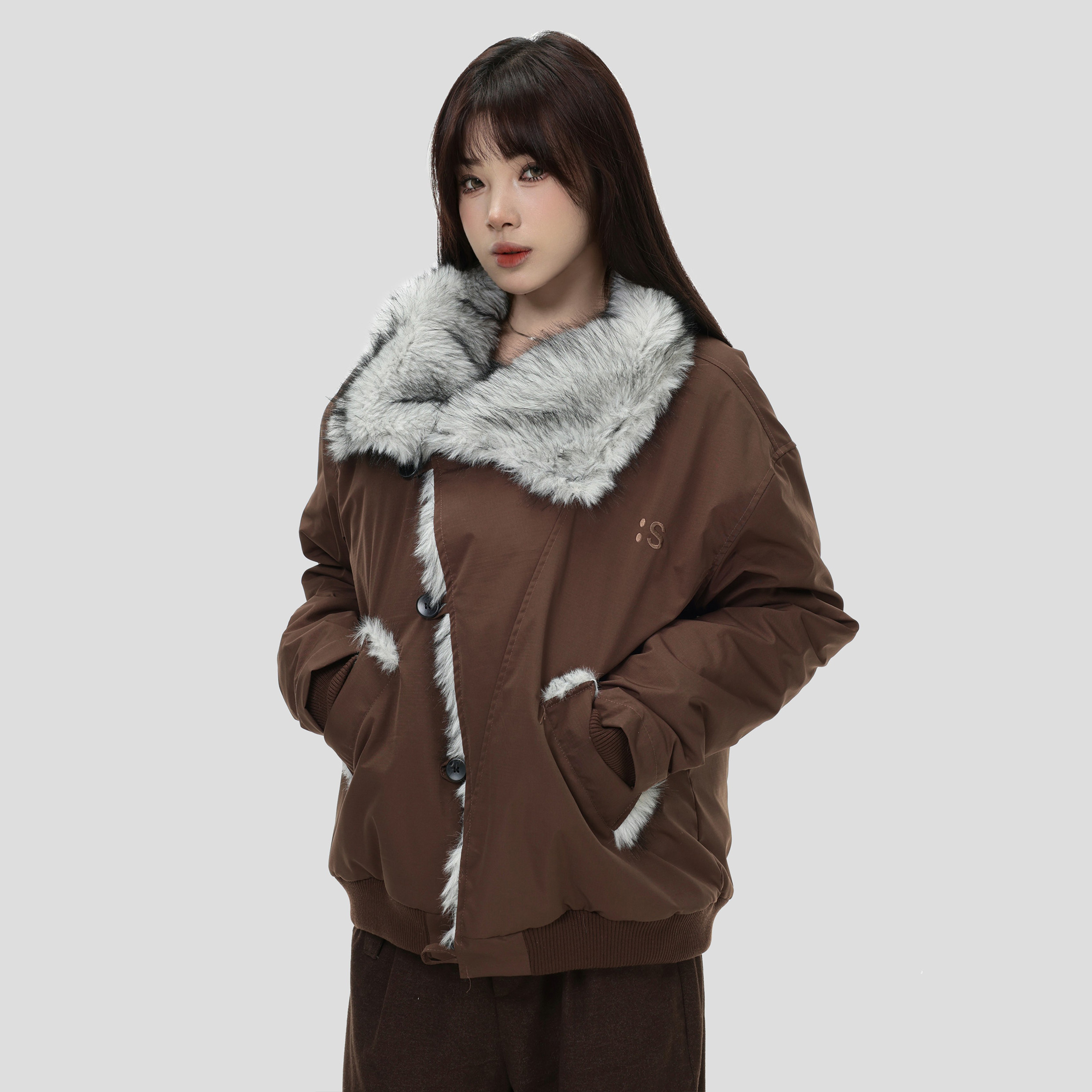 INSstudios 国潮美式「大翻领毛领斜门襟棉服」宽松保暖棉衣外套