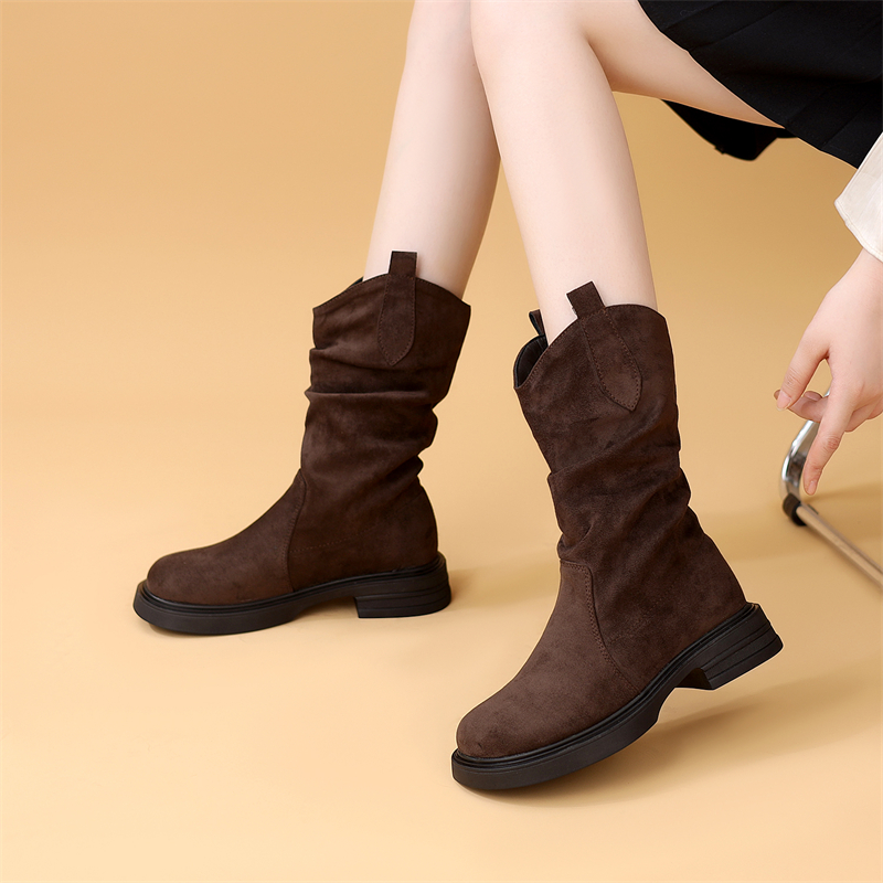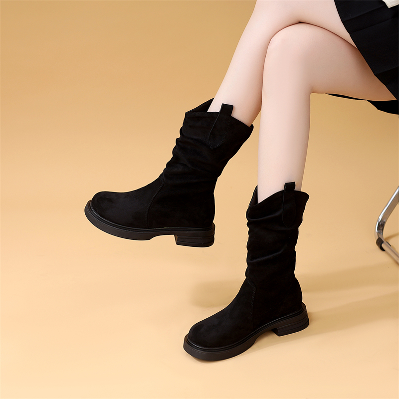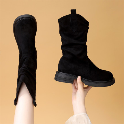 休闲厚底防滑高靴女冬季加绒中筒靴平底V口瘦瘦靴保暖弹力马丁靴
