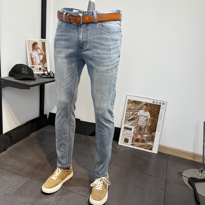 男士夏季薄款百搭修身小脚浅蓝色牛仔裤男长裤