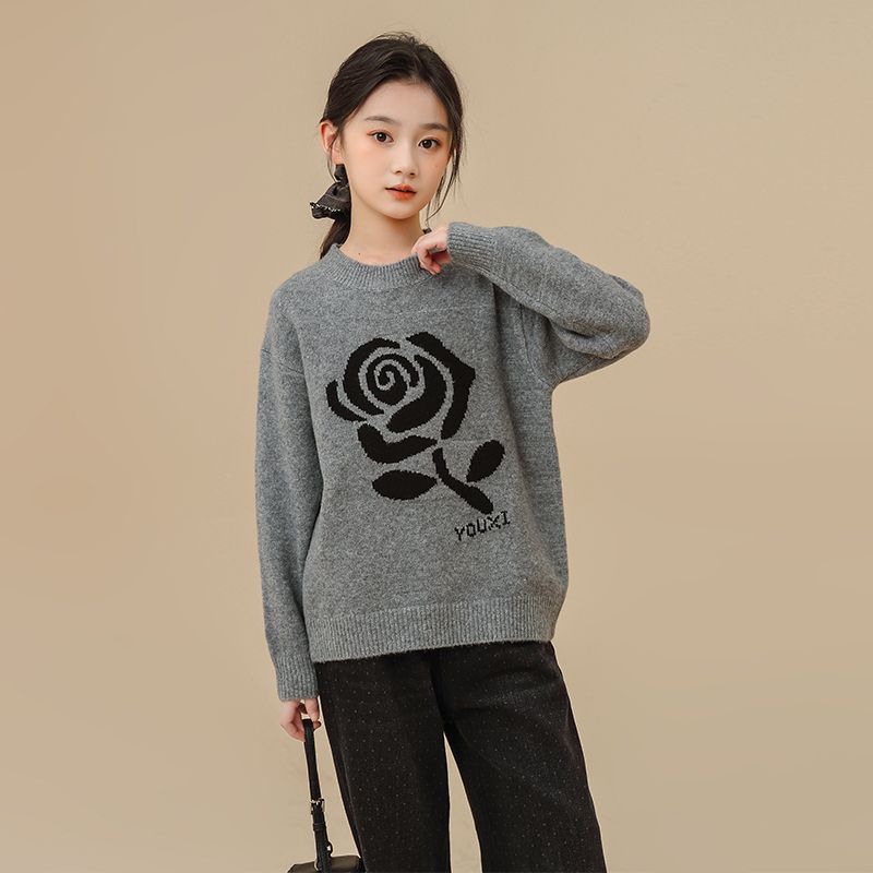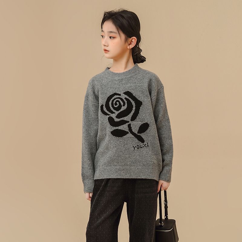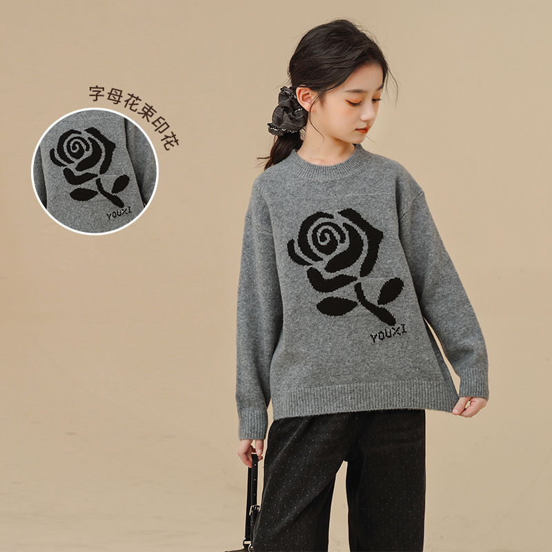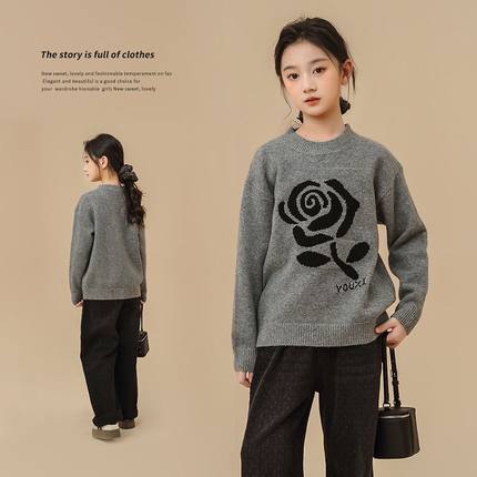 清仓女童毛衣秋冬儿童圆领套头灰色针织衫中大童提花上衣冬装童装