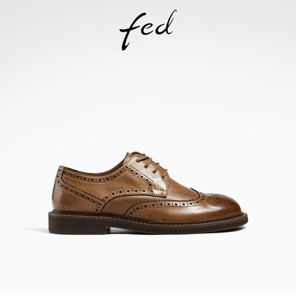 fed英伦风皮鞋春季新款女鞋粗跟深口单鞋布洛克鞋女D1230-YAB209