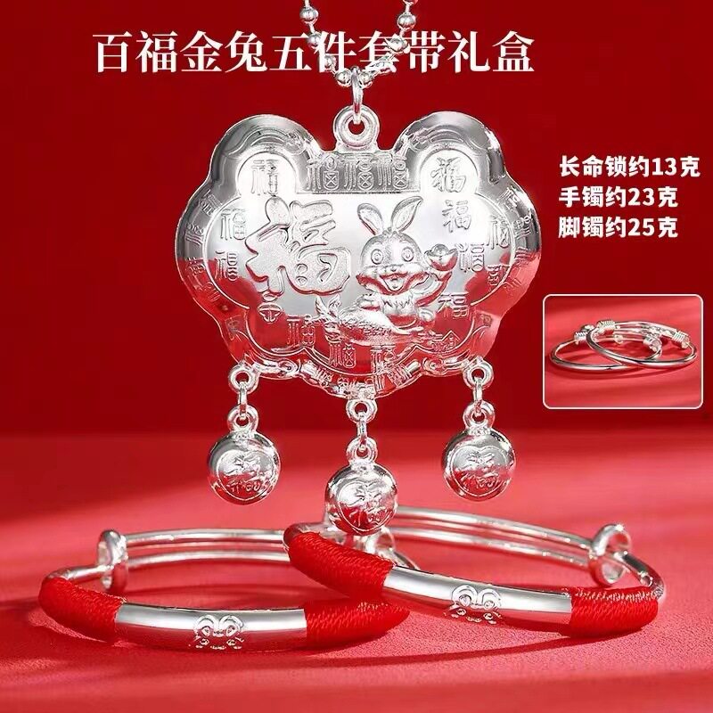 兔年宝宝手镯脚镯银饰套装兔年首饰新生儿满月送礼镀银长命锁项坠