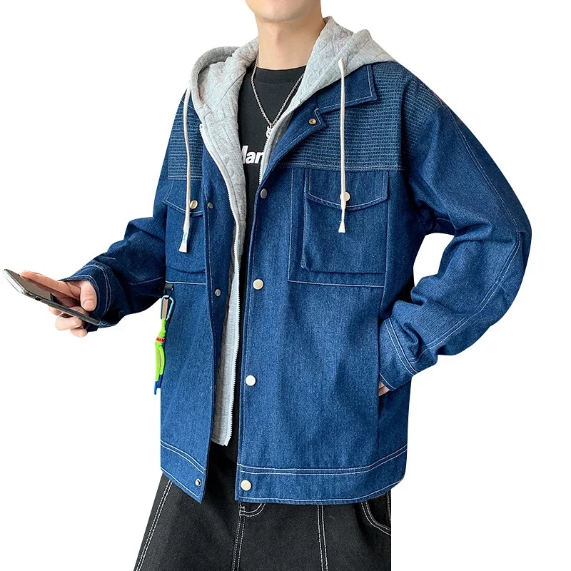 震哥同款 男士外套春秋季工装假两件连帽牛仔夹克长袖