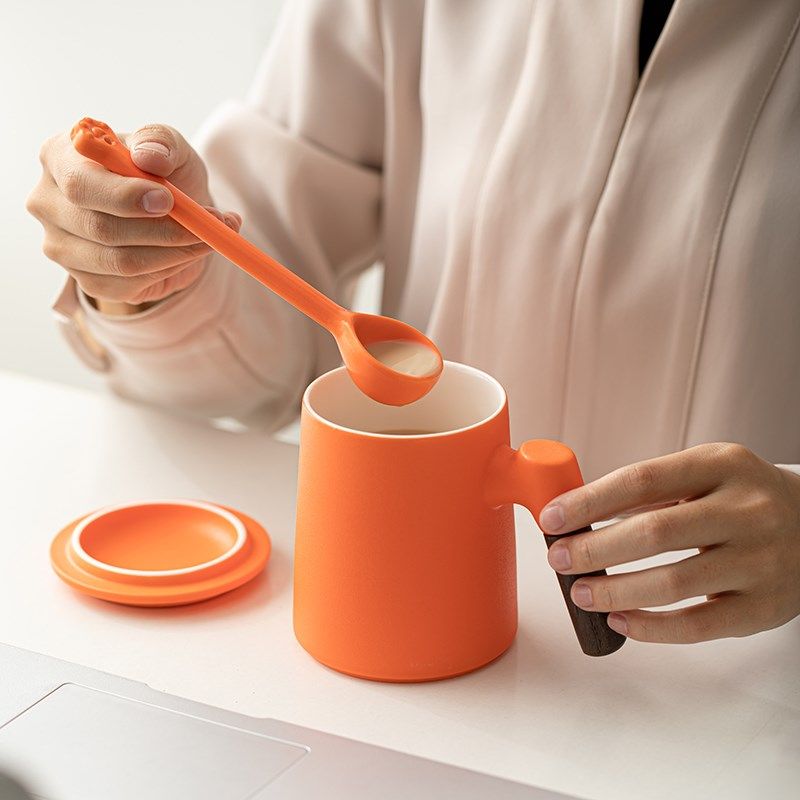 陶瓷马克杯咖啡杯勺子橙色办公杯带手柄小众设计感水杯可定制logo