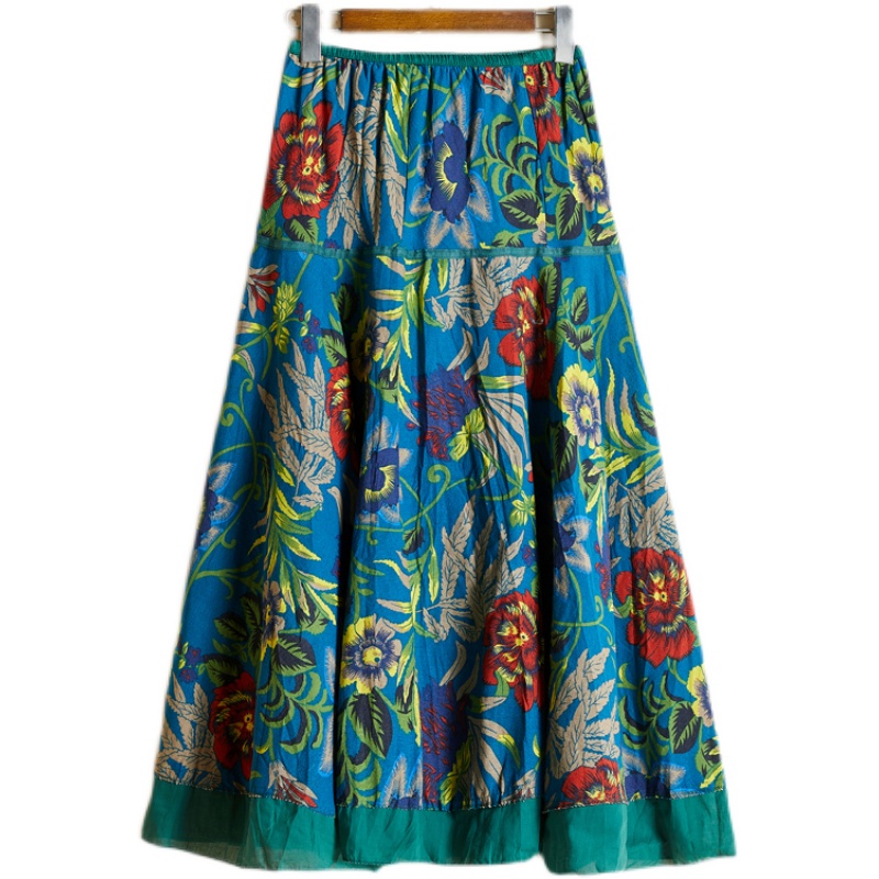 棉麻半身裙长裙中长款夏亚麻文艺印花大摆旅游广场舞百褶a字裙子