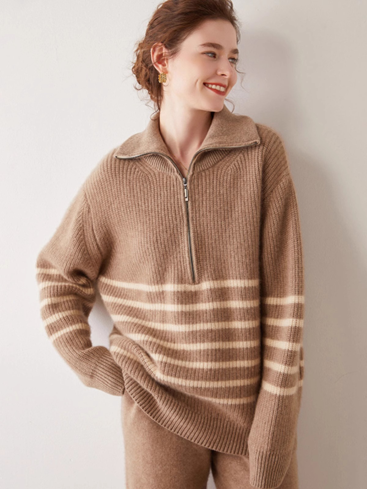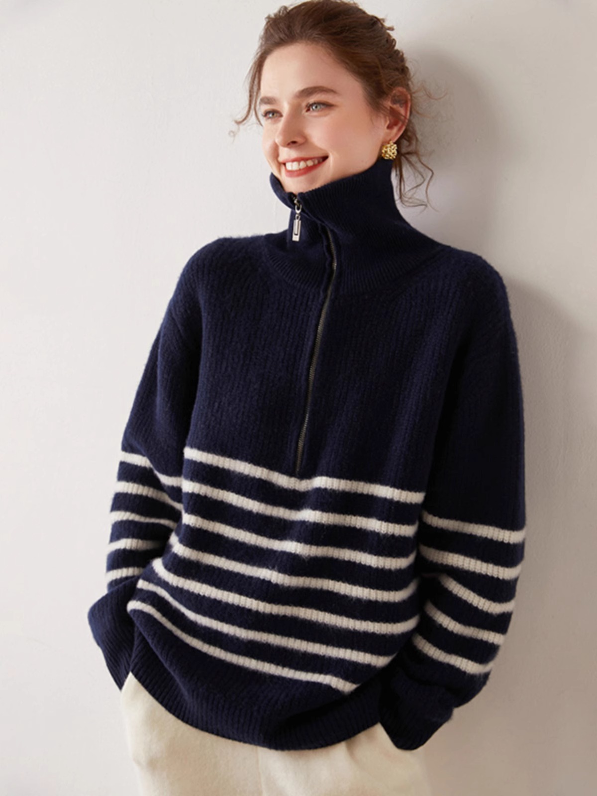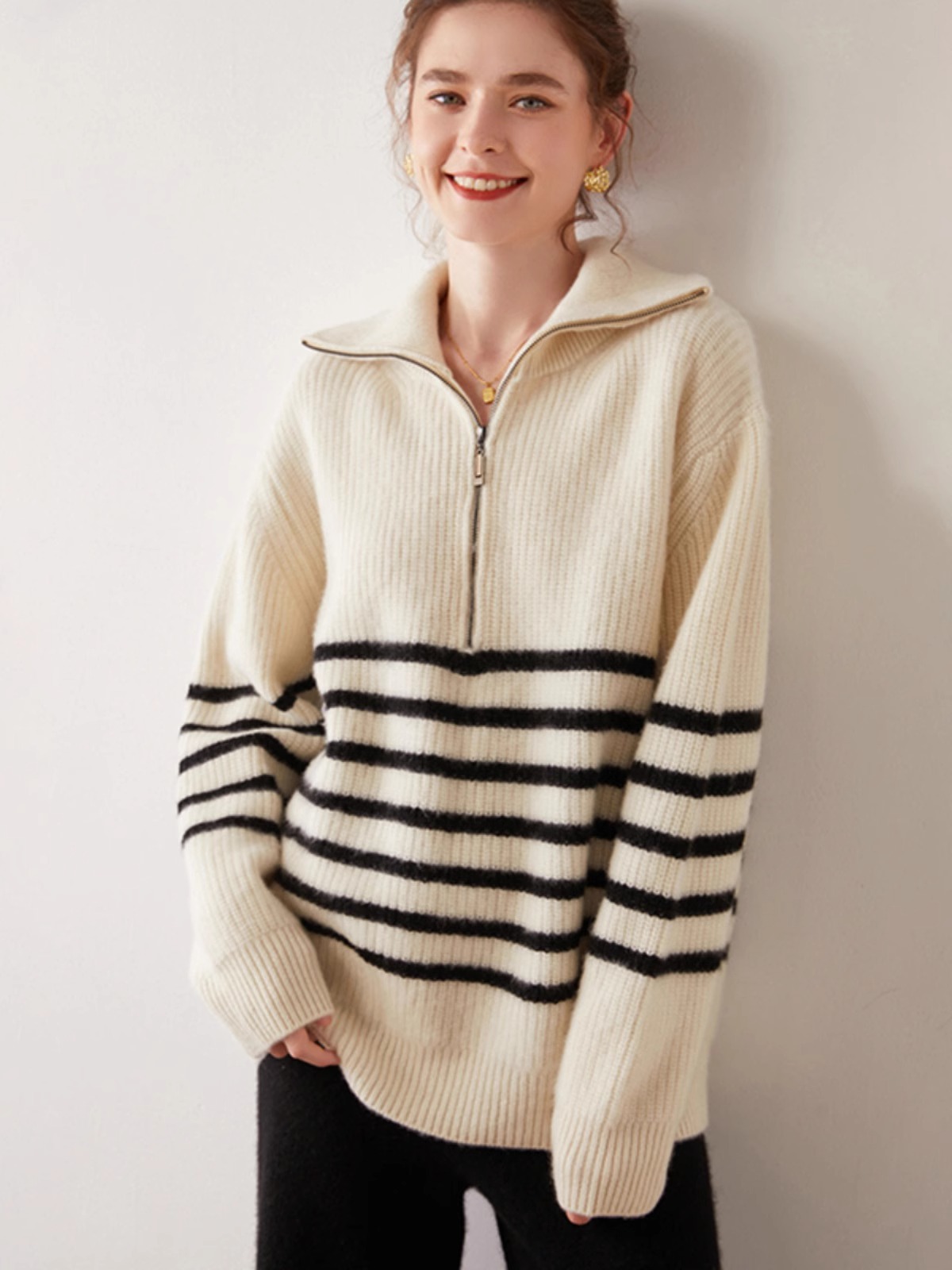 法系慵懒风半拉链黑白条纹纯山羊绒毛衣女宽松卫衣长袖设计感外套