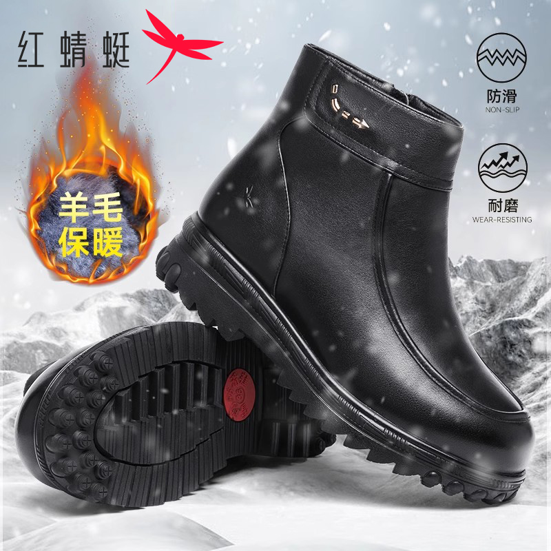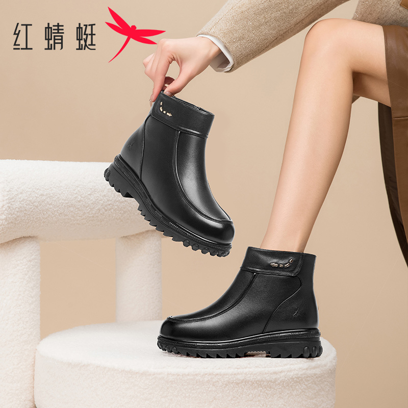 红蜻蜓女鞋时尚休闲舒适女短靴真皮轻便防滑保暖妈妈鞋加绒马丁靴