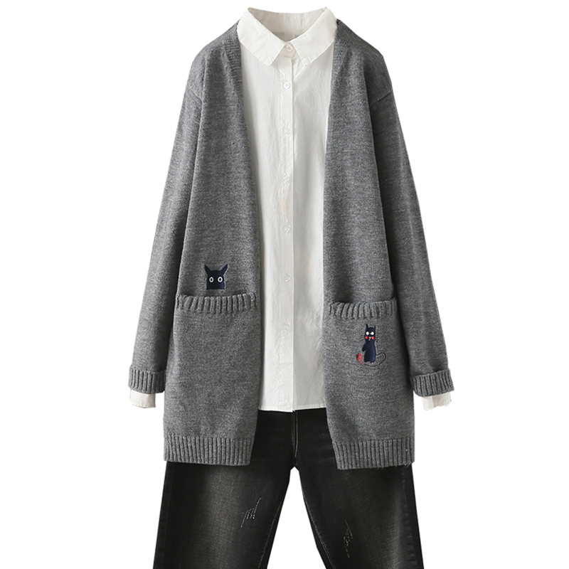 秋冬微胖MM200斤宽松纯色口袋绣花中长款毛衣开衫百搭外套女2018