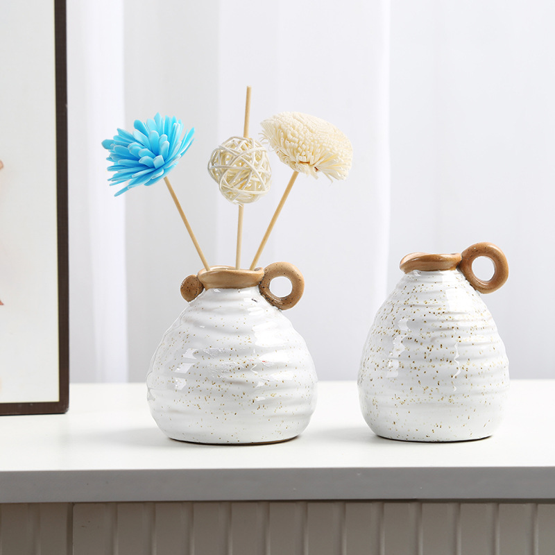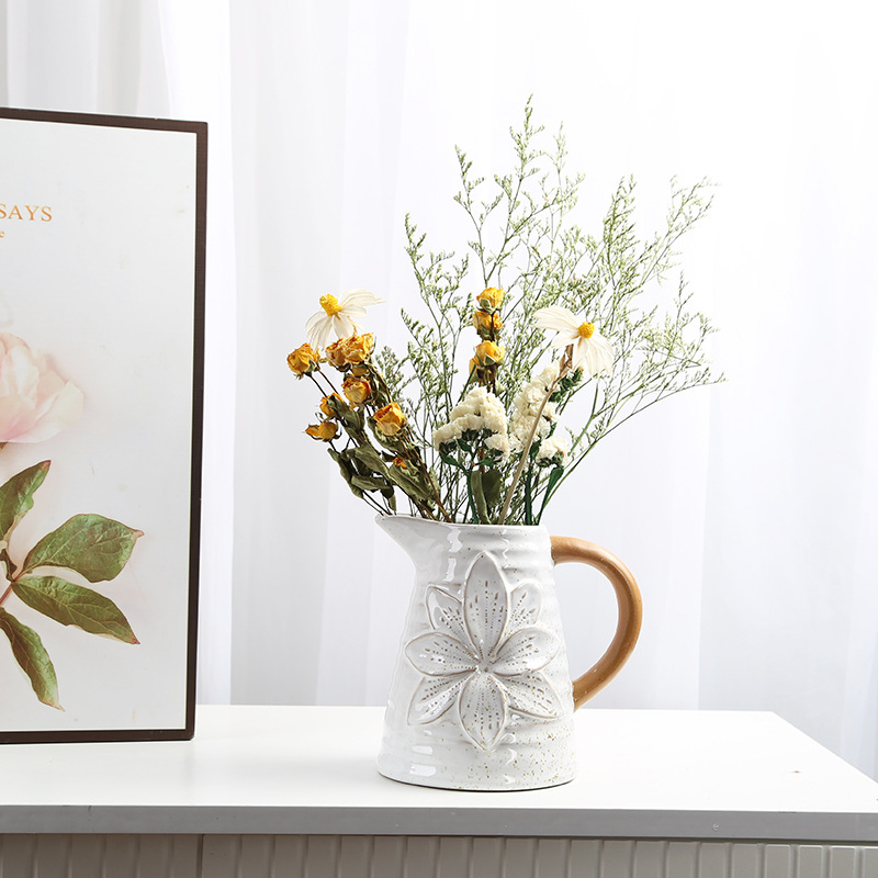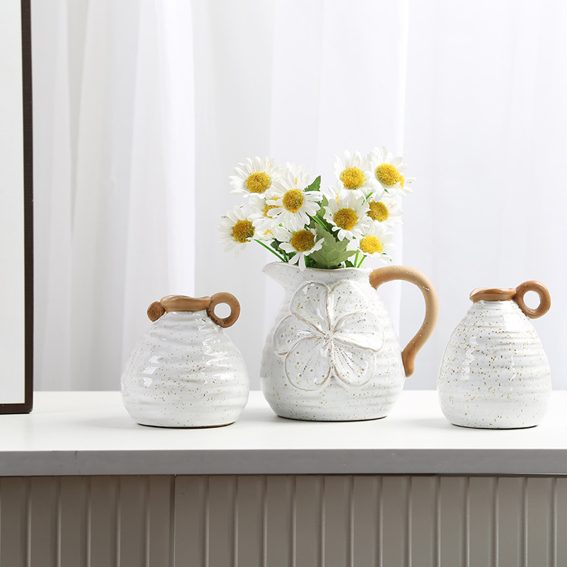 北欧撞色带把手陶瓷花瓶美式乡村复古民宿桌面水培小花插摆件