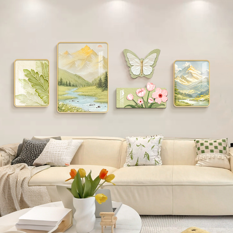 奶油风客厅装饰画山水画沙发背景墙挂画小众艺术日照金山组合壁画
