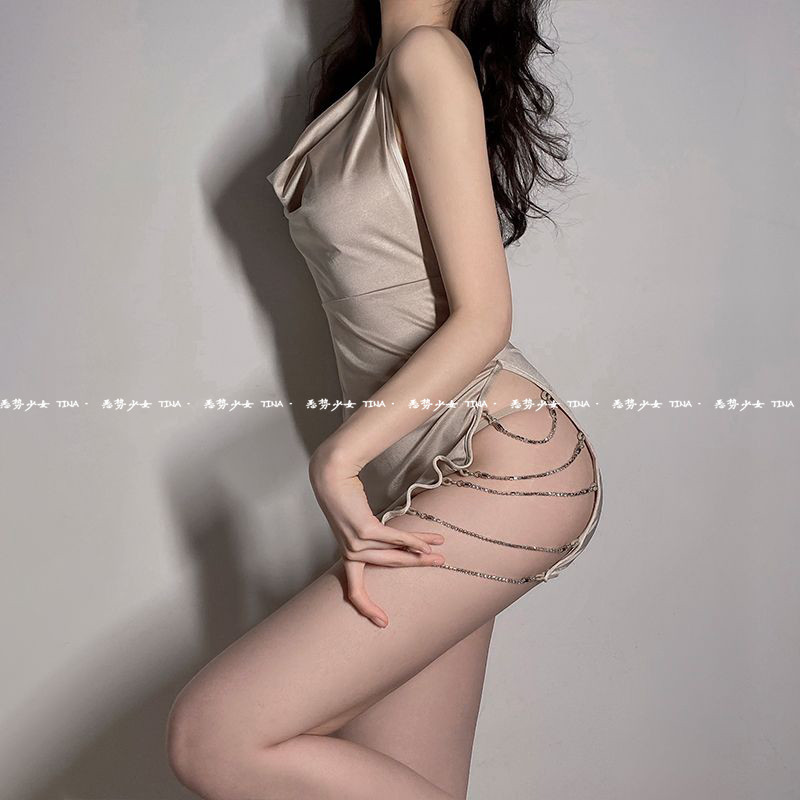 性感吊带挂脖连衣裙链条露背紧身包臂睡裙辣妹夜店开叉私房睡衣女
