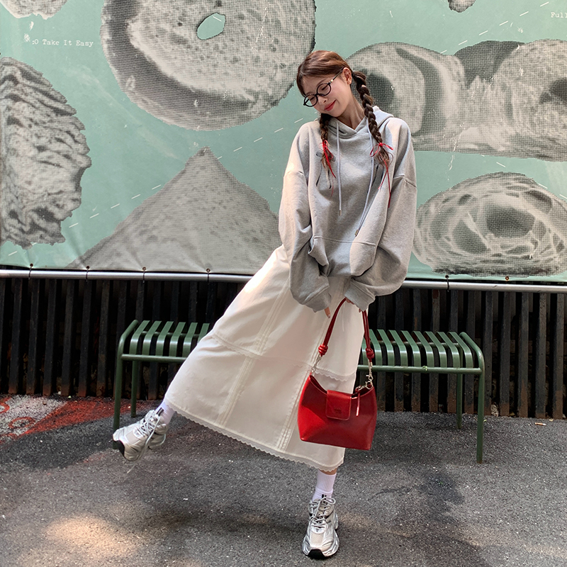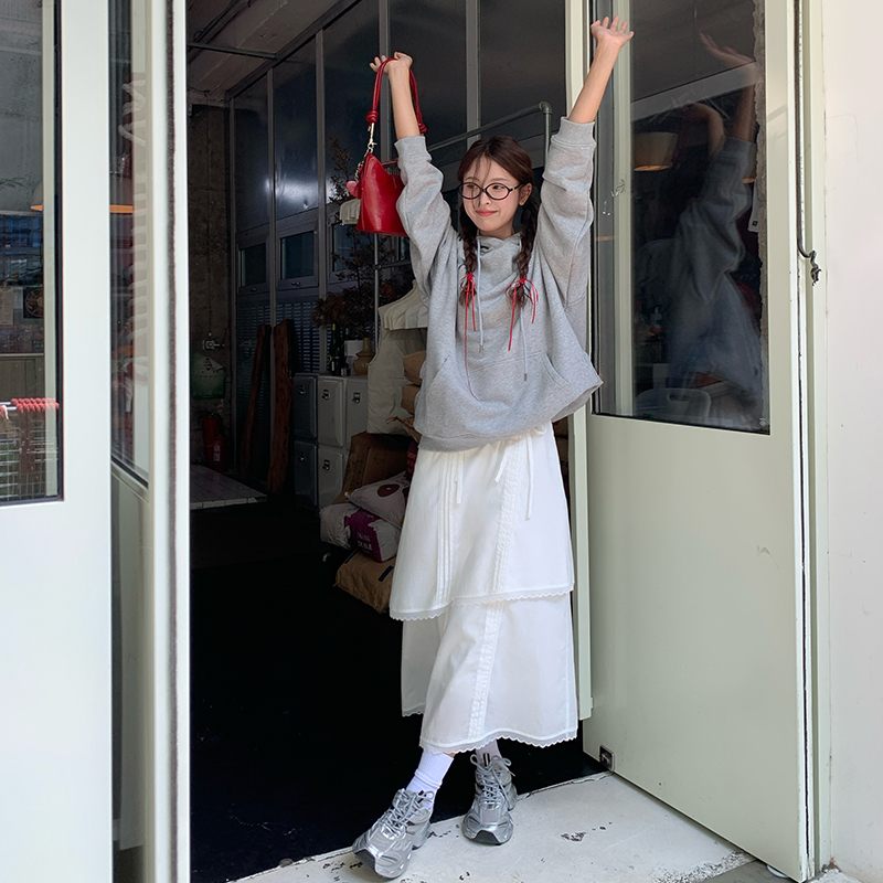 尺尺间Lsland压褶蕾丝边半身裙女春秋抽绳高腰不规则中长款蛋糕裙