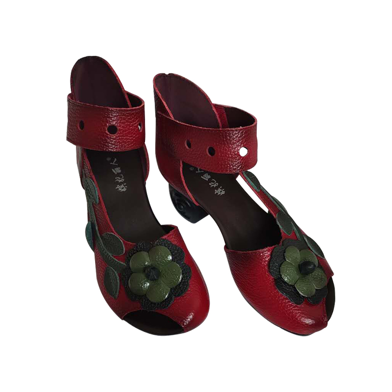 民族风粗跟花朵真皮鱼嘴凉鞋女