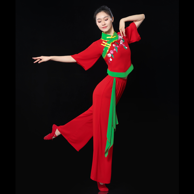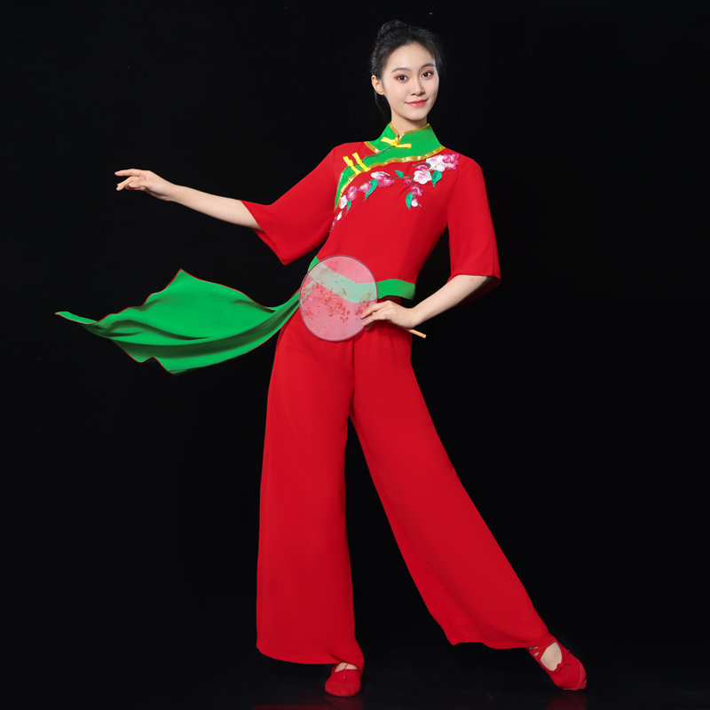 秧歌演出服2025新款扇子舞打鼓服广场舞蹈服装夏季冰丝麻面料迎亲