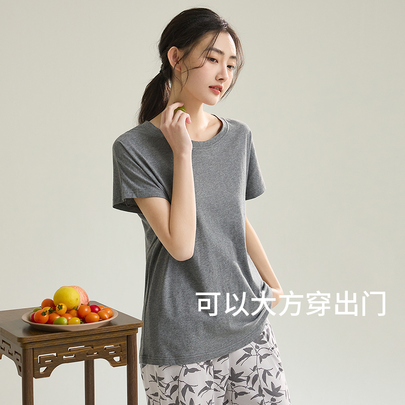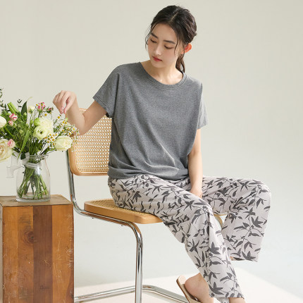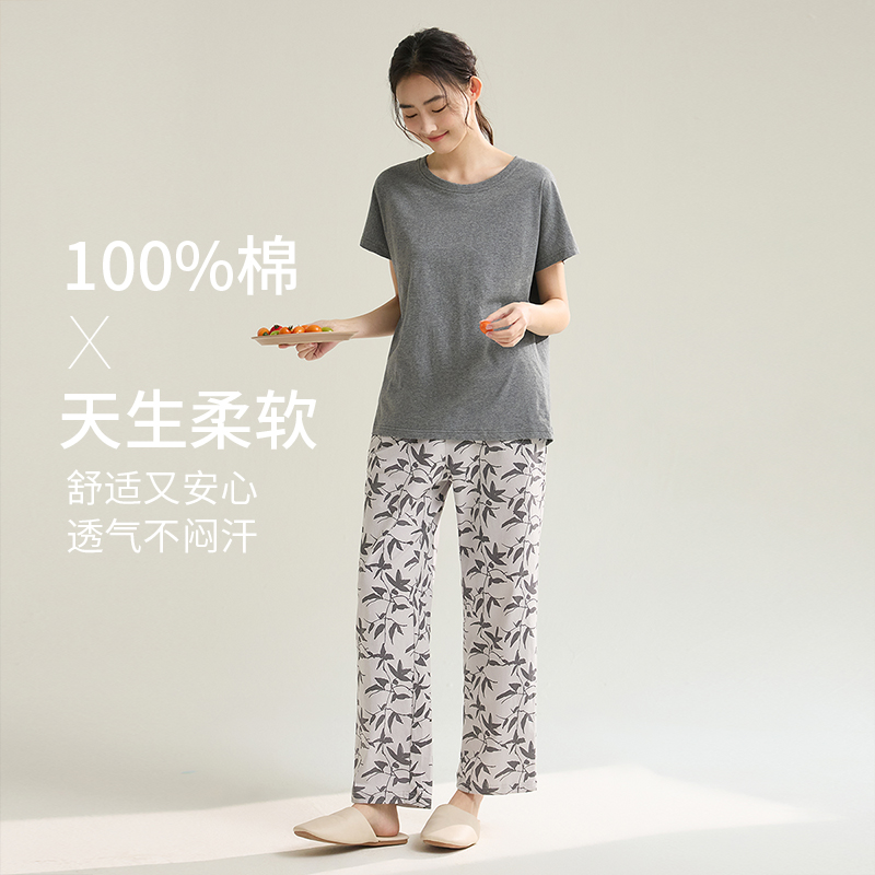 康妮雅纯棉睡衣女款胸垫新款夏季全棉短袖长裤妈妈休闲家居服套装