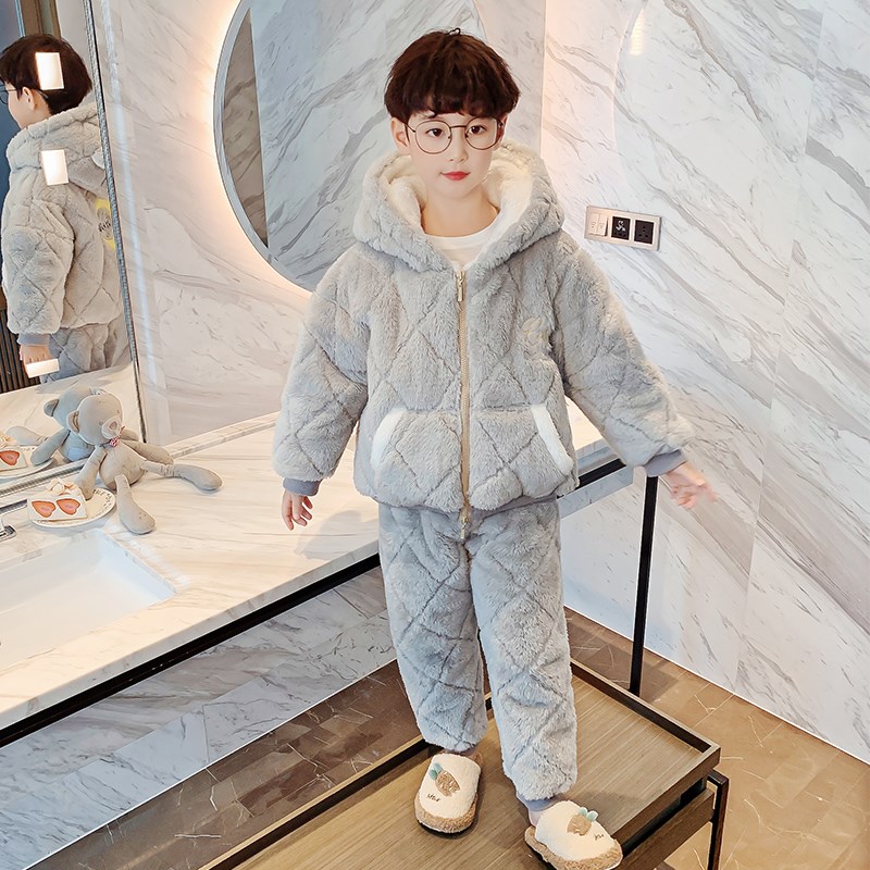 儿童睡衣加厚款男孩秋冬季加绒男童珊瑚绒三层夹棉家居服法兰绒