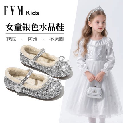 FVM女童鞋子儿童银色加绒公主水晶鞋2026新款春季闪亮艾莎小女孩