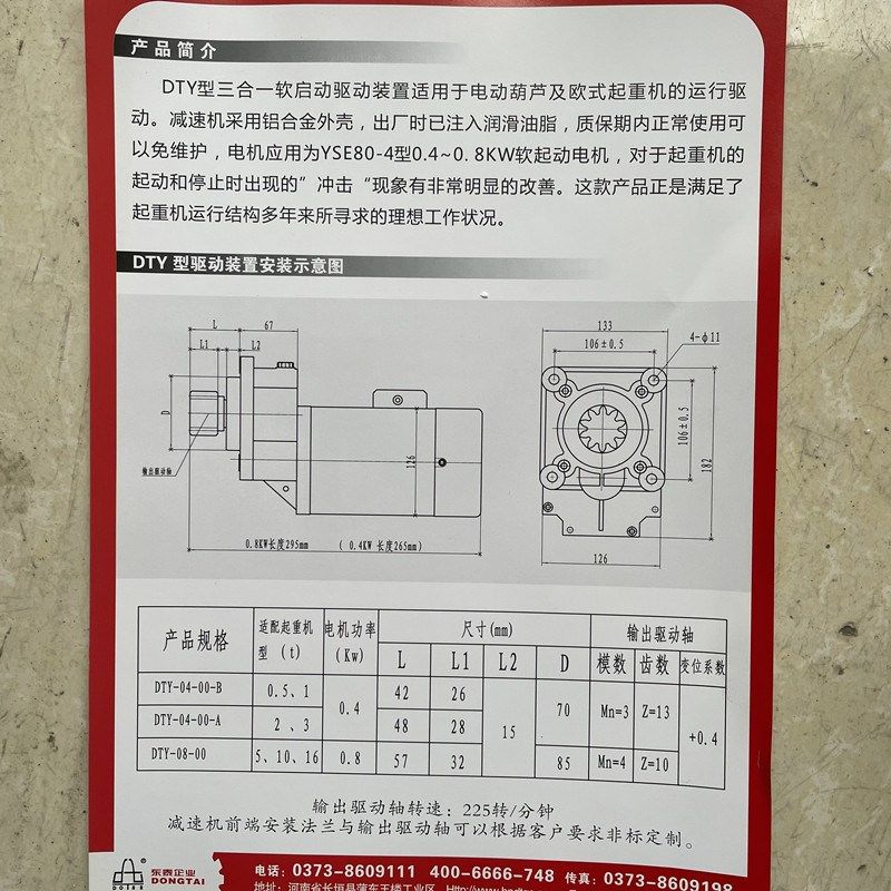 河南东泰齿轮三合一驱动减速机 葫芦跑车一体化电机 DTY-R0.8-5.8