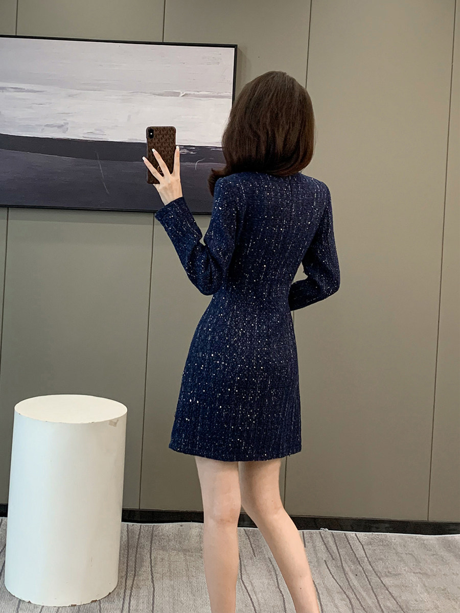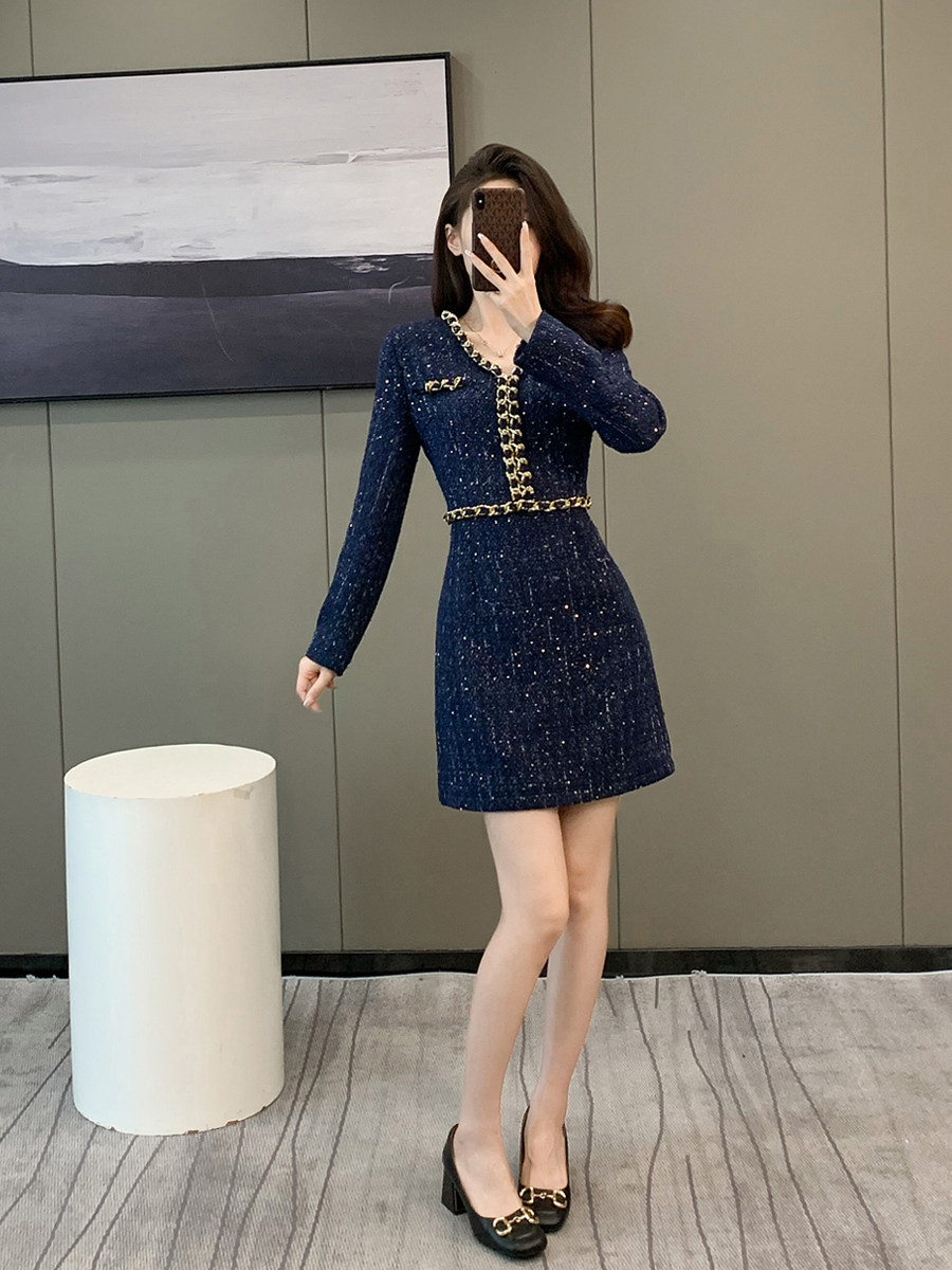 轻奢优雅V领修身编织链条亮片毛呢裙女秋冬季小香风粗花呢连衣裙