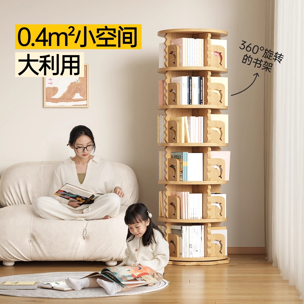 实木旋转书柜360度落地家用会本收纳置物架儿童书架客厅玩具卧室