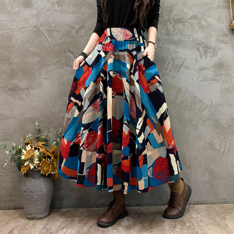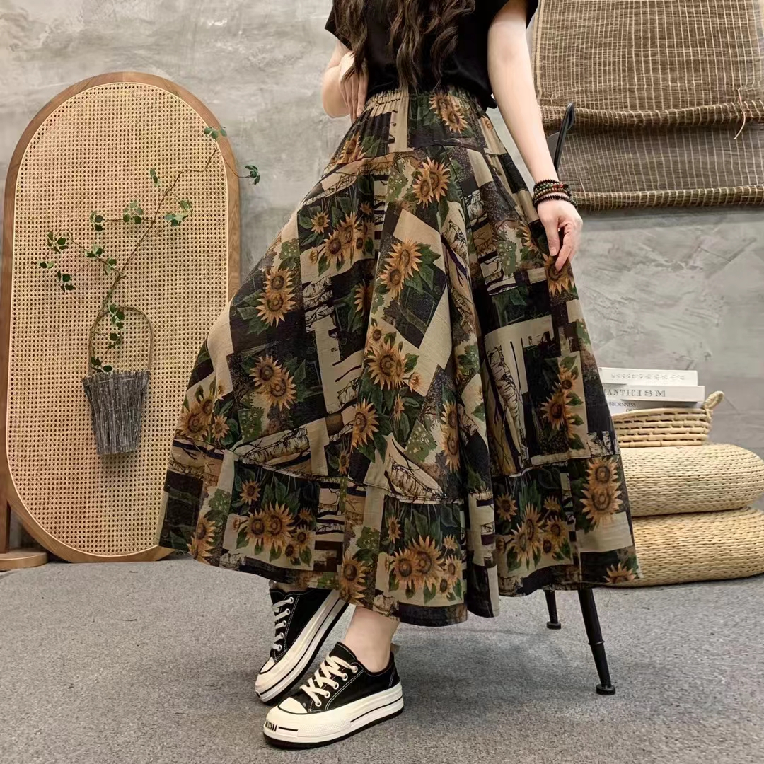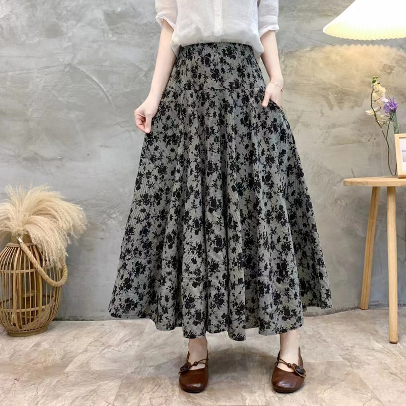 春秋新款棉麻碎花半身裙文艺复古百搭气质显瘦高腰女中长款A字裙