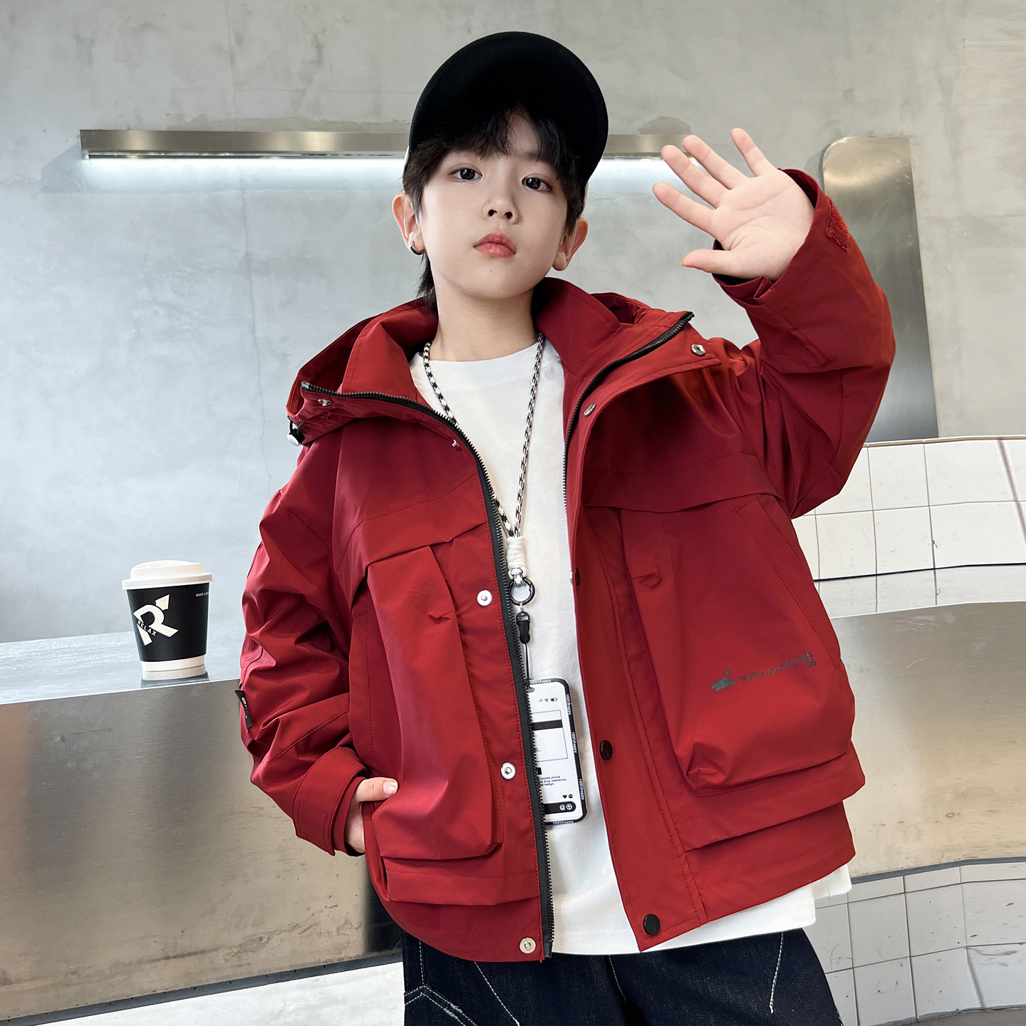 男童秋装工装外套2025新款儿童秋季冲锋衣中大童红色连帽上衣