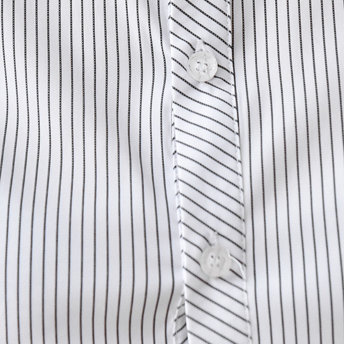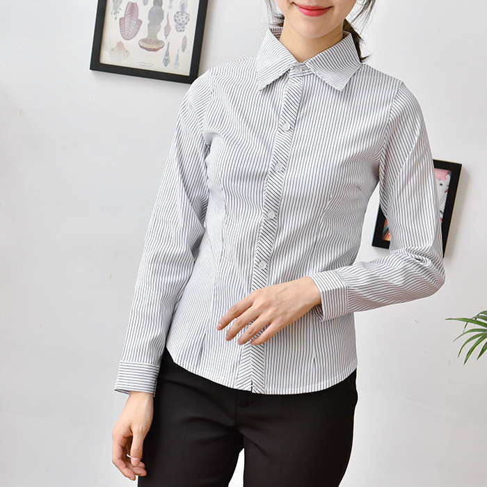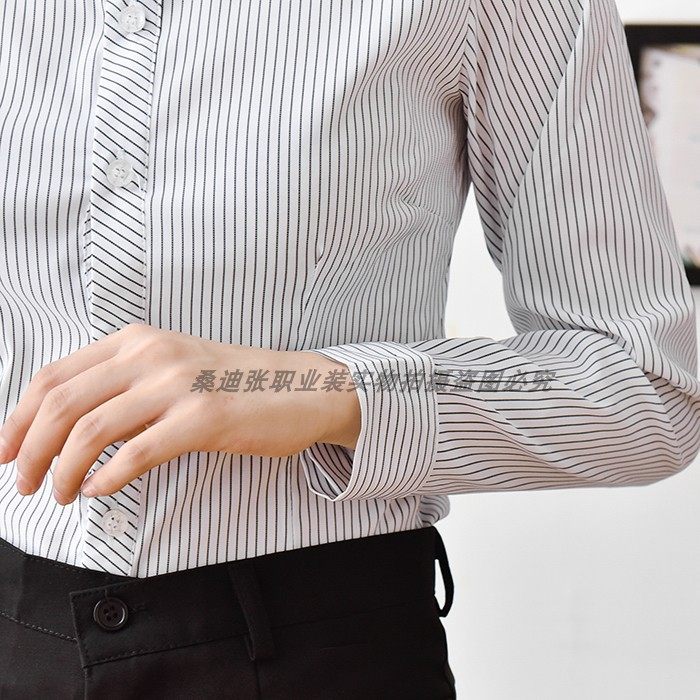弹力棉翻领黑白竖条纹女衬衣 修身长袖白衬衫ol大码工装职业装