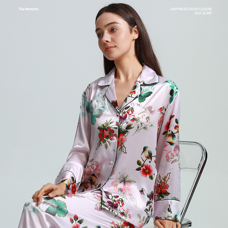 100%桑蚕丝清新高档印花套装春秋夏季真丝睡衣套装宽松家居服女士
